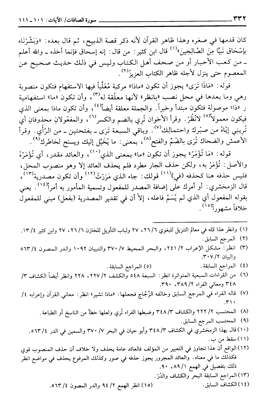 قوله: {مَاذَا ترى} يجوز أن تكون «ماذا» مركبة مُغَلَّباً فيها الاستفهام فتكون منصوبة وهي وما بعدها في محل نصب «بانظر» لأنها معلّقة له، وأن تكون «ما» استفهامية و «ذا» موصولة فتكون مبتدأ وخبراً. والجملة معلقة أيضاً وأن تكون ماذا بمعنى الذي فيكون معمولاً لانْظُرْ. وقرأ الأخوان تُرِي بالضم والكسر، والمعُولانِ محذوفانِ أي تُرِينِ إيَّاهُ من صبْرك واحتمالِك وباقي السبعة تَرَى - بفتحتين - من الرَّأي.