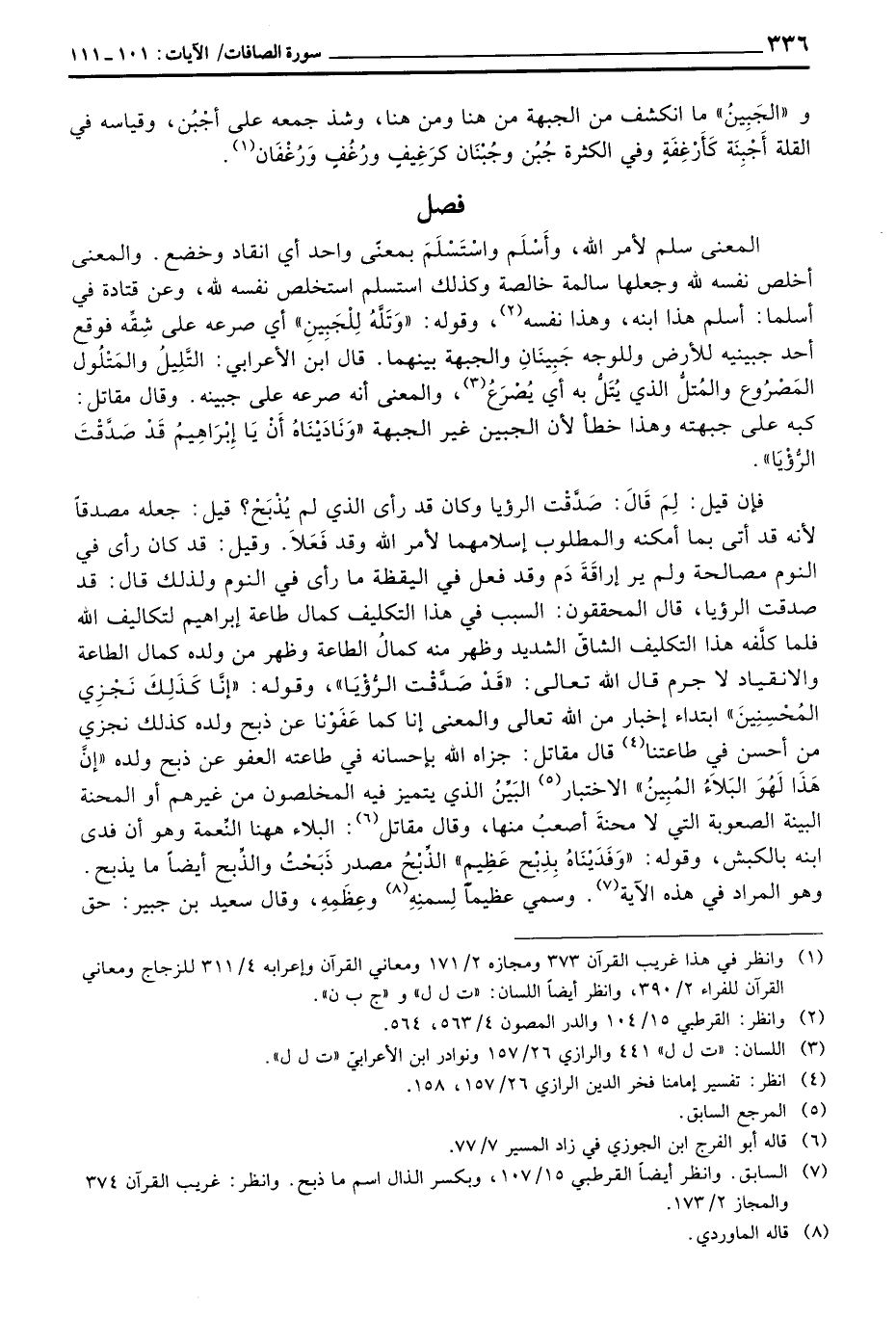 والمعنى سلم لأمره الله، وأَسْلَم واسْتَسْلَمَ بمعنًى واحد أي انقاد وخضع. والمعنى أخلص نفسه لله وجعلها سالمة خالصة وكذلك استسلم استخلص نفسه لله، وعن قتادة في سلما: أسلم هذا ابنه، وهذا نفسه، وقوله: {وَتَلَّهُ لِلْجَبِينِ} أي صرعه على شِقِّه فوقع أحد جبينيه للأرض وللوجه جَبِينَانِ والجبهة بينهما. قال ابن الأعرابي: التَّلِيلُ والمَتْلُون المَصْرُوع والمُتلُّ الذي يُتَلُّ به أي يُصْرَعُ والمعنى أنه صرعه على جبينه وقال مقاتل: كبه على جبهته وهذا خطأ لأن الجبين غير الجبهة {وَنَادَيْنَاهُ أَن ياإبراهيم قَدْ صَدَّقْتَ الرؤيآ} .