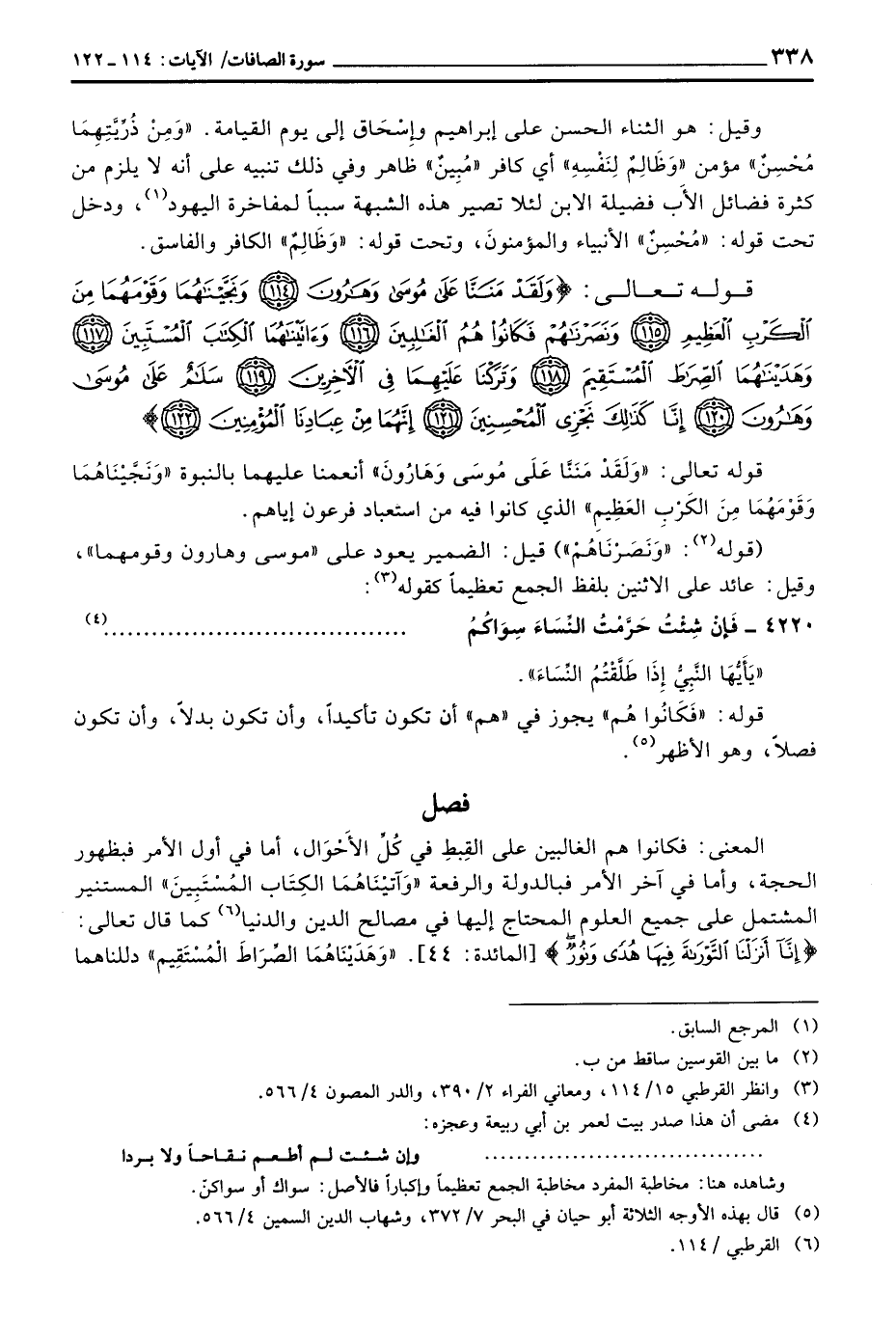 المعنى: فكانوا هم الغلبين على القِبطِ في كُلِّ الأَحْوَال، أما في أول الأمر فظهور الحجة، وما في آخر الأمر فبالدولة والرفعة {وَآتَيْنَاهُمَا الكتاب المستبين} المتنير المشتمل على جميع العلوم المحتاج إليها في مصالح الدين والدنيا كما قال تعالى: {إِنَّآ أَنزَلْنَا التوراة فِيهَا هُدًى وَنُورٌ} [المائدة: 44] {وَهَدَيْنَاهُمَا الصراط المستقيم} دللناهما