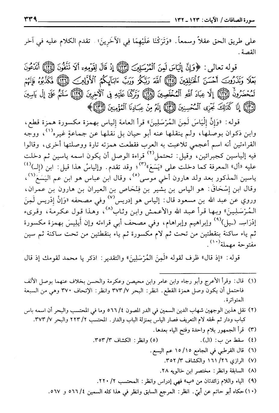 قوله: {وَإِنَّ إِلْيَاسَ لَمِنَ المرسلين} قرأ العامة إلياس بهمزة مكسورة همزة قطع، وابن ذكوان بوصلها، ولم ينقلها عنه أبو حيان بل نقلها عن جماعةٍ غيره، ووجه القراءتين أنه اسم أعجمي تلاعبت به العرب فقطعت همزته تارة وصلتها أخرى، وقالوا فيه إلياسين كجبرائين، وقيلك تحتمل قراءة الوصل أن يكون اسمه ياسين ثم دخلت عليه «أل» المعرفة كما دخلت على «يَسَعَ» ؛ وقد تقدم وإلياسُ هذا قيلك ابن (إِل) ياسين المذكرو بعد ولد هارون أخي موسى، وقال ابن عباس هو ابن عم اليَسَعَ وقال ابن إسْحَاقَ: هو الياس بن بشير بن فِنْحَاص بن العيران بن هارون بن عمران، ووري عن عبد الله بن مسعود قال: إلياس هو إدريس وفي مصحفه «وَإنَّ إِدْريس لَمِنَ المُرْسَلِينَ» وبها قرأ عبد الله والأعمش وابن وثاب، وهذا قول عكرمة، وقرئ إدْرَاسِ (يل) وإبراهيم وإبراهام، وفي مصحف أبي قراءته وإن أَيلِيسَ بهمزة مكسورة ثم ياء ساكنة بنقطتين من تحت ثم لام مكسورة ثم ياء بنقطتين من تحت ساكنة، ثم سين مفتوحة مهملة.