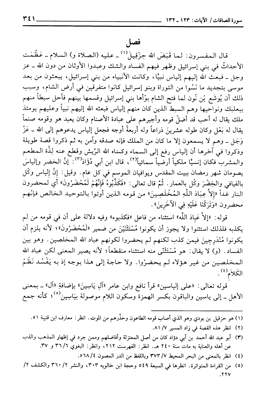 قال المفسرون: لما قَبَضَ الله حِزْقِيلَ عليه (الصلاة و) السلام - عَظُمَت الأحداثُ في بني إسرائيل وظهر فيهم الفساد والشك وعبدوا الأوثان من دون الله - عَزَّ وَجَلَّ - فبعث الله إليهم إلياس نبيُّا، وكانت الأنبياء من بني إسرائيلن يبعثون من بعد موسى بتجديد ما نَسُوا من التوراة وبنو إسرائيل كانوا متفرقين في أرض الشام، وسبب ذلك أن يُوشَع بْن نُون لما فتح الشام بوّأها بني إسرائيل وقسمها بينهم فأحل سبطاً منهم ببعلبك ونواحيها وهم السبط الذين كان من هم إلياس فبعثه الله إليهم نبياً وعليهم يومئذ ملك يقال له أحب قد أضلّ قومه وأجبرهم على عبادة الأصنام وأن يعبد هو وقومه صنماً يقال له بَعْل وكان طوله عشرينَ ذارعاً وله أربعةُ أوجه فجعل إلياس يدعوهم إلى الله - عَزَّ وَجَلَ - وهم لا يسمعون إلى ما كان من الملك فإنه صدقه وآمن به ثم ذكروا قصة طويلة وذكروا في آخرها ان إلياس رفع إلى السماء وكساه الله الرِّيش وقطع عنه لِذَّة المطعم والمشرب فكان إنسيًّا ملكياً أرضياً سمائياً، قال ابن أبي دُؤَادَ: إنَّ الخضر وإلياسَ يصومان شهر رمضان ببيت المقدس ويوافيان الموسم في كل عام.