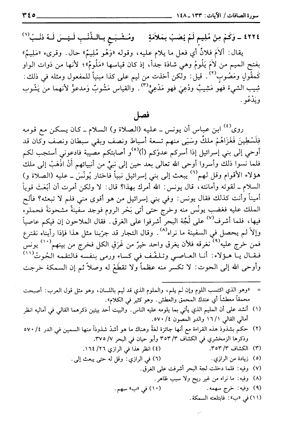 روى ابن عباس أن يونس - عليه (الصلاة و) السلام - كان يسكن مع قومه فِلَسْطِينَ فَغَزَاهُمْ ملكٌ وسَبَى منهم تسعة أسباط ونصف وبقي سبطان ونصف وكان قد أوحي إلى بني إسرائيل إذا أسركم عدوّكم (أ) وأصابتكم مصبة فادعوني أستجب لكم فلما نسوا ذلك وأسروا أوحى الله تعالى بعد حين إلى نبيٍّ من أنبيائهم أنْ اذْهَبْ ألى ملك هؤلاء الأقوام وقل لهم يبعث إلى بني إسرائيل نبياً اختار يُونُسَ - عليه (الصلاة و) السلام - لقوته وأمانته، قال يونس: الله أمرك بهذا؟ قال: لا ولكن امرت أن أبْعَثُ قوياً أميناً وأنت كذلك فقال يونس: وفي بني إسرائيل من هو أقوى مني فلم لا تبعه؟ فألح الملك عليه فغضب يونُس منه وخرج حتى أتى بَحْر الروم فوجد سفينةً مشحونةً فحملوه فيها، فلما أشرف على لُدَّة البحر أشرفوا عل الغرق. فقال الملاحون إن فيكم عاصايً وإلاّ لم يحصل في السفية ما نراه وقال خيرٌ من غَرَقِ الكل فخرج من بينهم يونس فقال يا هؤلاء: أنا العاصي وتلفّف في كساء ورمى بنفسه فالتقمه الحُوتُ وأوحى الله إلى الحوت: لا تكسر منه عظماً ولا تقطَعْ له وصلاً ثم إن السمكة خرجت