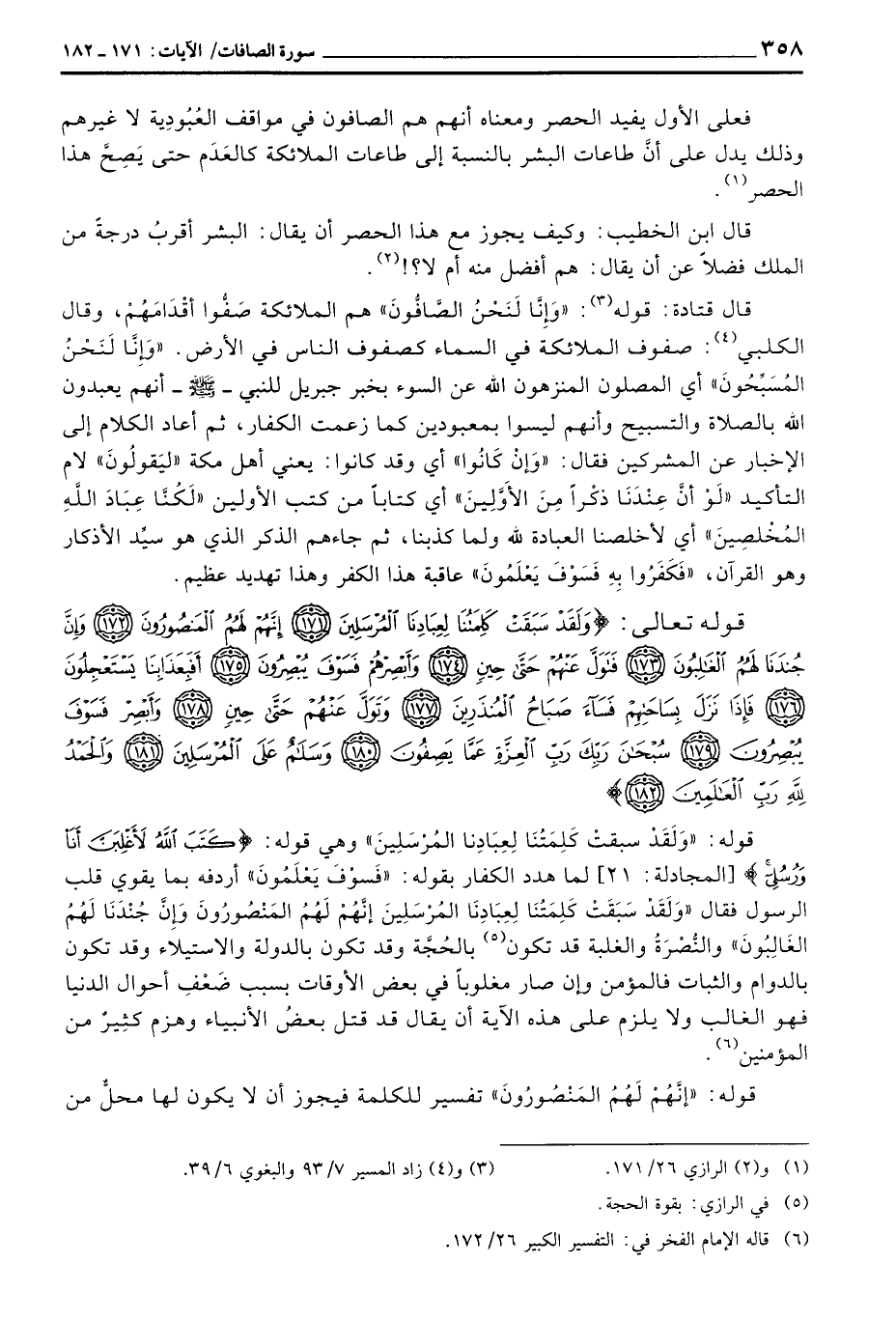 قوله: {وَلَقَدْ سَبَقَتْ كَلِمَتُنَا لِعِبَادِنَا المرسلين} وهي قوله: {كَتَبَ الله لأَغْلِبَنَّ أَنَاْ ورسلي} [المجادلة: 21] لما هدد الكفار بقوله: {فَسَوْفَ يَعْلَمُونَ} [الحجر: 3] أردفه بما يقوي قلب الرسول فقال {وَلَقَدْ سَبَقَتْ كَلِمَتُنَا لِعِبَادِنَا المرسلين إِنَّهُمْ لَهُمُ المنصورون وَإِنَّ جُندَنَا لَهُمُ الغالبون} والنُّصْرَةُ والغلبة قد تكون بالحُجَّة وقد تكون بالدولة والاستيلاء وقد تكون بالدوام والثبات فالمؤمن وإن صار مغلوباً في بعض الأوقات بسبب ضَعْفِ أحوال الدنيا فهو الغالب ولا يلزم على هذه الآية أن يقال قد قتل الأنبياء وهزم كثيرةٌ من المؤمنين.