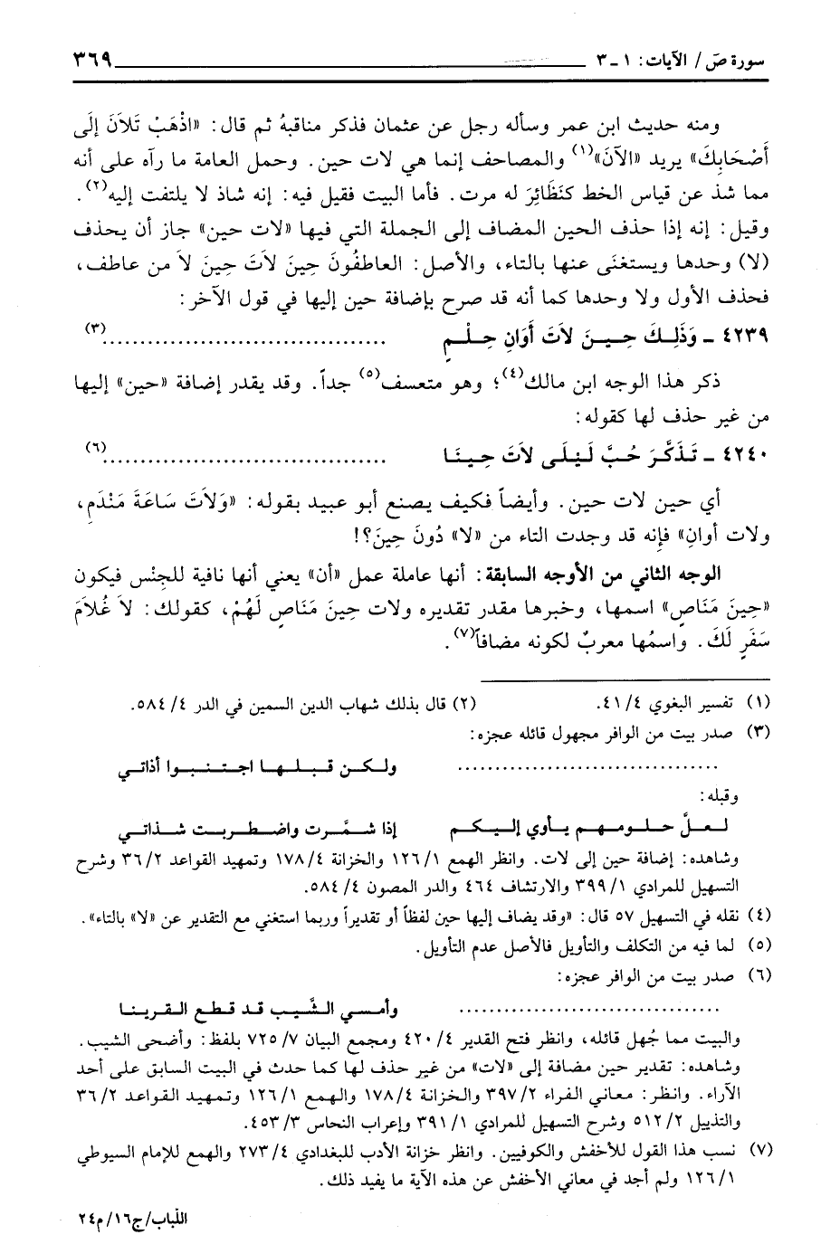 أي حين لات حين. وأيضاً فكيف يصنع أبو عبيدة بقوله: «وَلاَتَ سَاعَةَ مَنْدَمِ، ولات أوانِ» فإِنه قد وجدت التاء من «لا» دُونَ حِينَ؟!