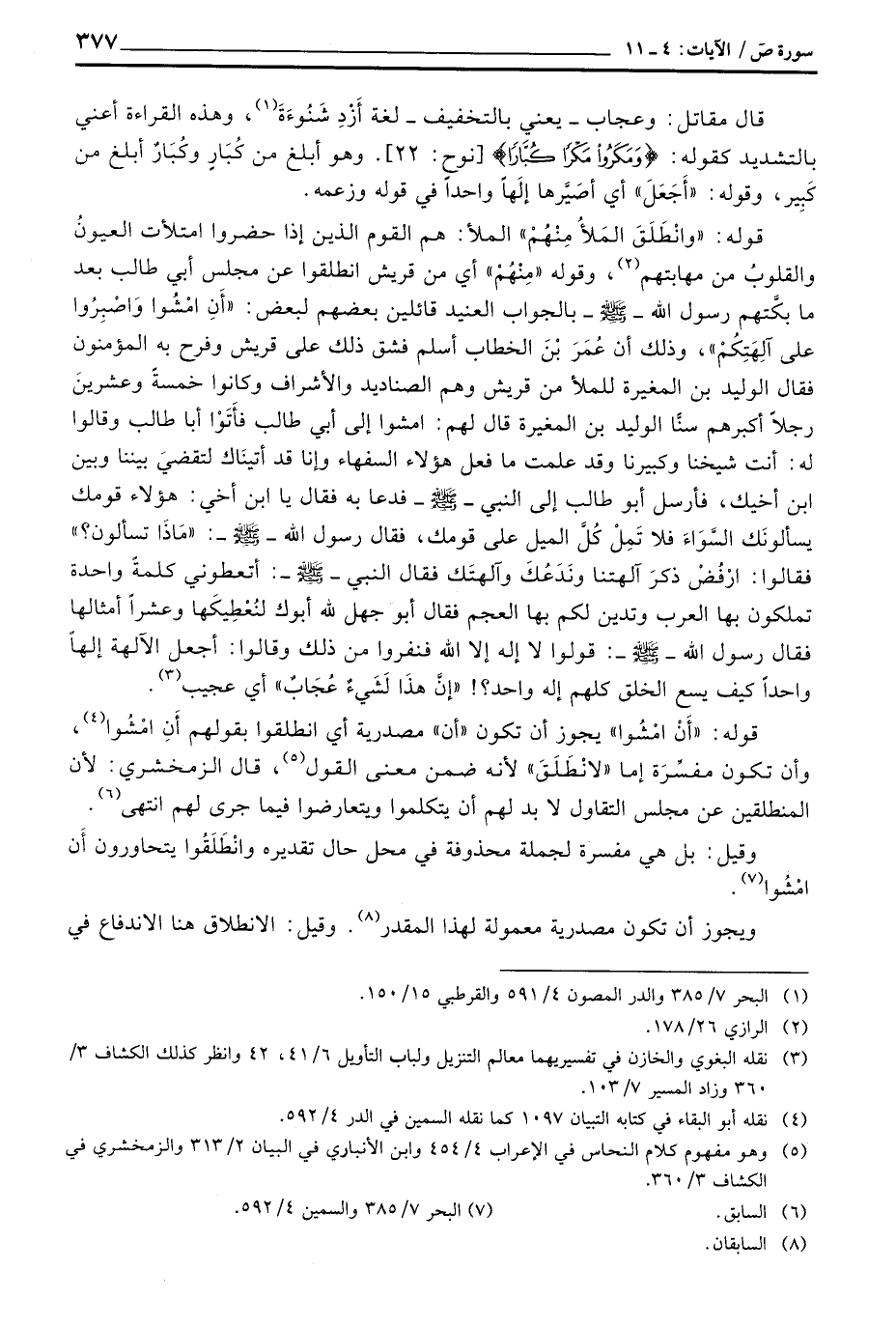 قوله: {وانطلق الملأ مِنْهُمْ} الملأ: هم القوم الذين إذا حضروا امتلأت العيونُ والقلوبُ من مهابتهم، وقوله «مِنْهُمْ» أي من قريش انطلقوا عن مجلس أبي طالب بعد ما بكَّتهم رسول الله - صَلَّى اللَّهُ عَلَيْهِ وَسَلَّم َ - بالجواب العنيد قائلين بعضهم لبعض: «أَنِ امْشُوا وَاصْبِرُوا على آلِهَتِكُمْ» ، وذلك «أن عُمَرَ بْنَ الخطاب أسلم فشق ذلك على قريش وفرح به المؤمنون فقال الوليد بن المغيرة للملأ من قريش وهم الصناديد والأشراف وكانوا خمسةً وعشرينَ رجلاً أكبرهم سنًّا الوليد بن المغيرة قال لهم: امشوا إلى أبي طالب فأتَوْا أبا طالب وقالوا له: انت شيخنا وكبيرنا وقد علمت ما فعل هؤلاء السفهاء وإنا قد أتينَاك لتقضيَ بيننا وبين ابن أخيك، فأرسل أبو طالب إلى النبي - صَلَّى اللَّهُ عَلَيْهِ وَسَلَّم َ - فدعا به فقال يا ابن أخي: هؤلاء قومك يسألونَك السَّوَاءَ فلا تَمِلْ كُلَّ الميل على قلومك، فقال رسول الله - صَلَّى اللَّهُ عَلَيْهِ وَسَلَّم َ -:» مَاذَا تسألون؟ «فقالوا: ارْفُضْ ذكرَ آلهتنا ونَدَعُكَ وآلهتَك فقال النبي - صَلَّى اللَّهُ عَلَيْهِ وَسَلَّم َ -: أعطوني كلمةً واحدة تملكون بها العرب وتدين لكمن بها العجز فقال أبو جهل لله أبوك لنُعْطِيكَها وعشراً أمثالها فقال رسول الله - صَلَّى اللَّهُ عَلَيْهِ وَسَلَّم َ -: قولوا لا إله إلا الله فنفروا من ذلك وقالوا: أجعل الآلهة إلهاً واحداً كيف يسع الخلق كلهم إله واحد؟} {هذا لَشَيْءٌ عُجَابٌ} أي عجيب» .