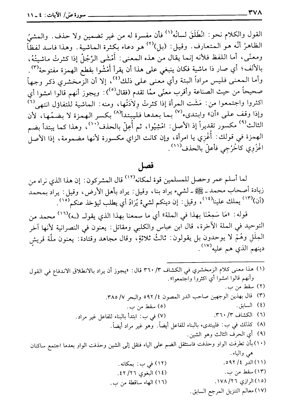 القول والقول والكلام نحو: انْطَلَقَ لسانُه فان مفسرة له من غير تضمين ولا حذف. والمشيُ الظاهرُ أنَّه هو المتعارف. وقيل: (بل) هو دعاء بكثرة الماشية. وهذا فاسد لفظاً بالألف؛ أي صار ذا ماشية فكان ينبغي على أن يقرأ أَمْشُوا بقطع الهمزة مفتوحة. وأما المعنى فليس مراداً البتة وأي معنى على ذلك، إلا أن الزمخشري ذكر وجهاً صحيحاً من حيث الصناعة وأقرب معنًى ممَّا تقدم (فقال) : ويجوز أنهم قالوا امشوا أي اكثروا واجتمعوا من: مَشَت المرأة إذا كثرتْ ولاَدَتُها، ومنه: الماشية للتفاؤل انتهى وإذا وقف على «أن» وابتدئ بما بعدها فليبتدأ بكسر الهمزة لا بضمِّها، لأن الثالث مكسرو تقديراً إذ الأصل: امْشِيُوا، ثم أُعِلّ بالحذف، وهذا كما يبتدأ بضم الهمزة في قولك: أُغْزِي يا امرأة، وإن كانت الزاي مكسورة لأنها مضمومة، إذا الأصل اعْزُوِي كاخْرُجِي فأعلّ بالحذف.