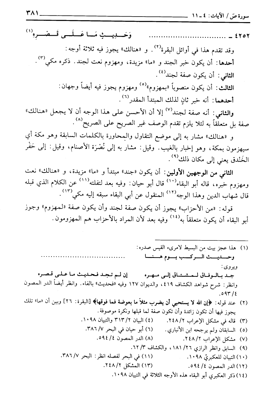الثاني من الوجهين الأولين: أن يكون «جند» مبتدأ و «ما» مزيدة، و «هنالك» نعت ومهزوم خبره، قاله أبو البقاء قال أبو حيان: وفيه بعد لتفلته عن الكلام الذي قبله قال شهاب الدين وهذا الوجه المنقول عن أبي البقاء يبقه إليه مكي.
