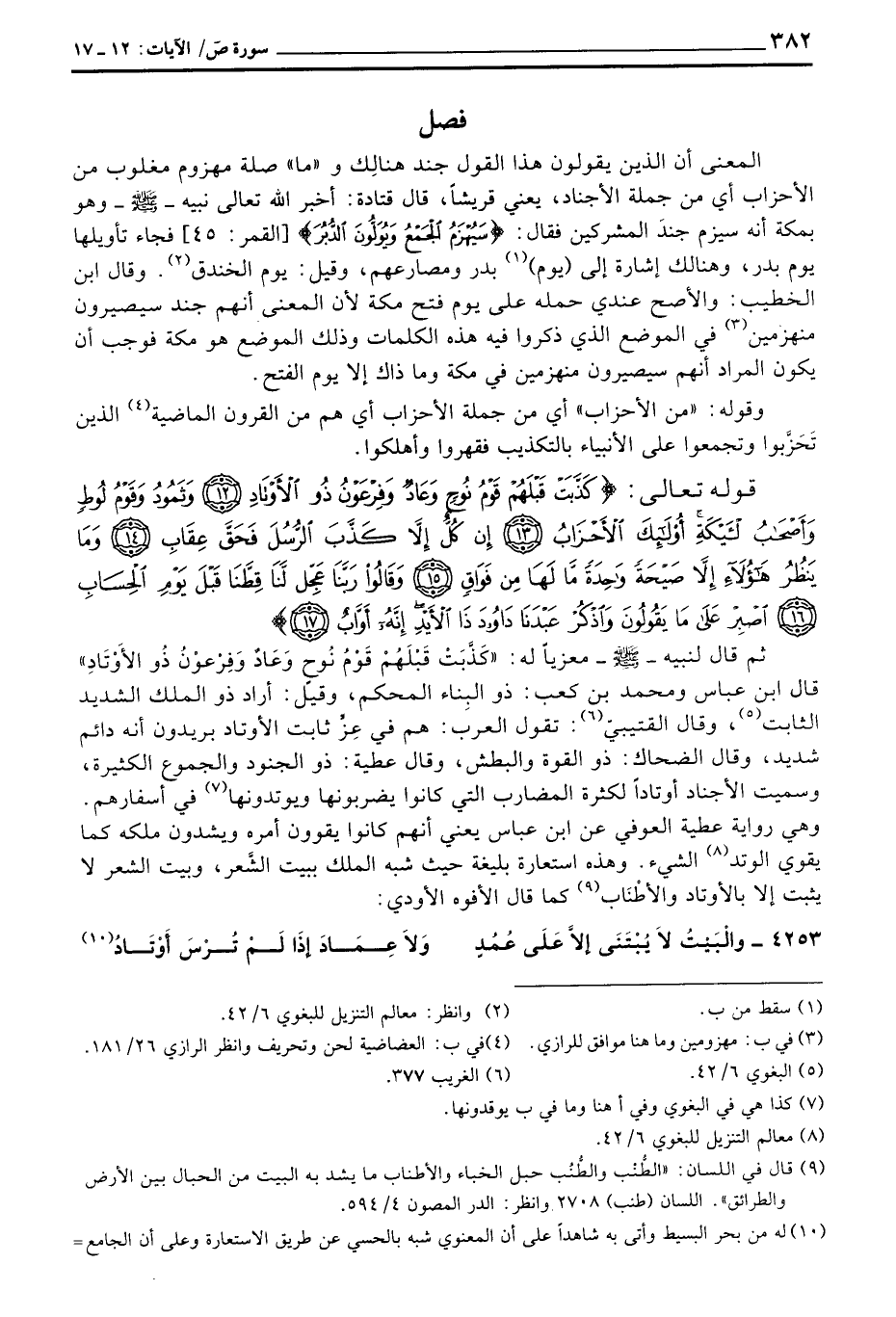 ثم قال لنبيه - صَلَّى اللَّهُ عَلَيْهِ وَسَلَّم َ - معزياً له: {كَذَّبَتْ قَبْلَهُمْ قَوْمُ نُوحٍ وَعَادٌ وفِرْعَوْنُ ذُو الأوتاد} قال ابن عباس ومحمد بن كعب: ذو البِناء المحكم، وقيل: أراد ذو الملك الشديد الثابت، وقال القتيبيّ: تقول العرب: هم في عِزٍّ ثابت الأوتاد بريدون أنه دائم شديد، وقال الضحاك: ذو القوة البطش، وقال عطية: ذو الجنود والجموع الكثيرة، وسميت الأجناد أوتاداً لكثرة المضارب التي كانوا يضربونها ويوتدونها في أسفارهم وهي رواية عطية العوفي عن ابن عباس يعني أنهم كانوا يقوون أمره ويشدون ملكه كما يثبت إلا بالأوتاد والأطْنَاب كما قال الأفوه الأودي: