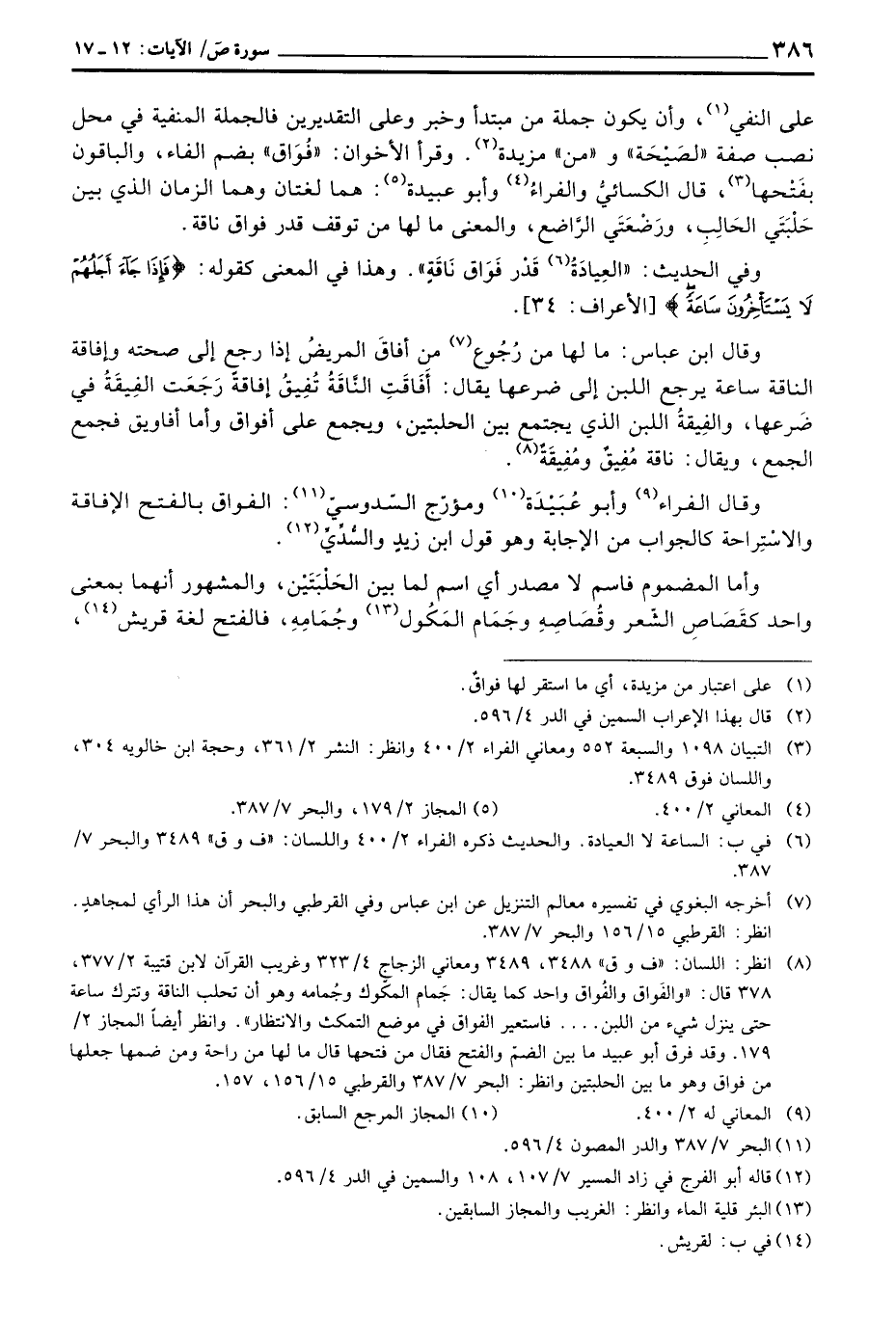 وقال ابن عباس: ما لها من رُجُوع من أفاقَ المريضُ إذا رجع إلى صحته وإفاقة الناقة ساعة يرجع اللبن إلى ضرعها يقال: أَفَاقَتِ النَّاقَةُ تُفِيقُ إفاقة رجَعَت الفِيقَةُ في ضَرعها، والفِيقةُ اللبن الذي يجتمع بين الحلبتين، ويجمع على أفواق وأما أفاويق فجمع الجمع، ويقال: ناقة مُفِيقٌ ومُفِيقَةٌ.