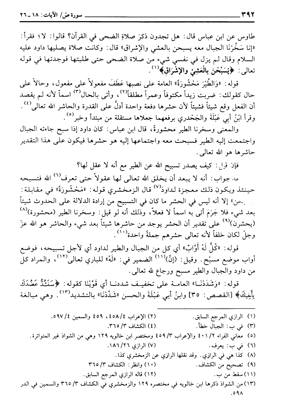 فالجواب: أنه لا يبعد أن يخلق الله تعالى لها عقولاً حتى تعرف الله فتسبحه حنيئذ ويكون ذلك معجزة لداودَ قال الزمخشري قوله: {مَحْشُورَةً} في مقابلة: «يسبحن» إلا أنه ليس في الحشر ما كان في التسبيح من إرادة الدلالة على الحدوث شيئاً بعد شيء فلا جَرَمَ أتى به اسماً لا فعلاً، وذلك أنه لو قيل: وسخرنا الطير (محشورة) (يحشرن) على تقدير أن الحشر يوجد من حاشرها شيئاً بعد شيء والحاشر هو الله عزّ وجلّ خلفاً لأنه تعالى حشرهم جملةً واحدة.