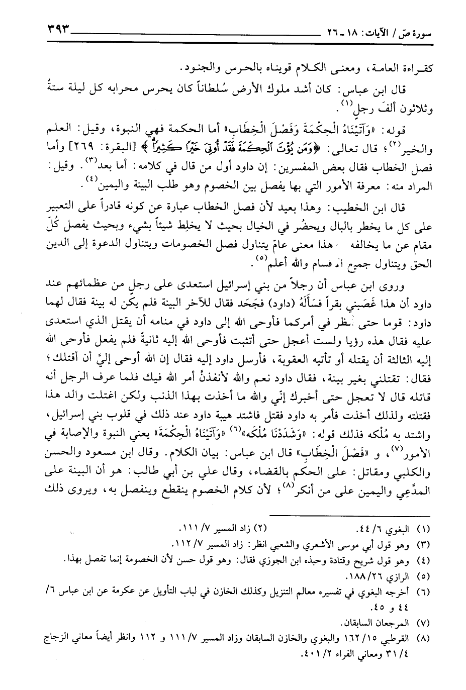 قوله: {وَآتَيْنَاهُ الحكمة وَفَصْلَ الخطاب} فهي النبوة، وقيل: العلم والخير؛ قال تعالى: {وَمَن يُؤْتَ الْحِكْمَةَ فَقَدْ أُوتِيَ خَيْراً كَثِيراً} [البقرة: 269] وأما فصل الخطاب فقال بعض المفسرين: إن داود أول من قال في كلامه: أما بعد وقيل: المراد منه: معرفة الأمور التي بها يفصل بين الخصوم وهو طلب البينة واليمين.
