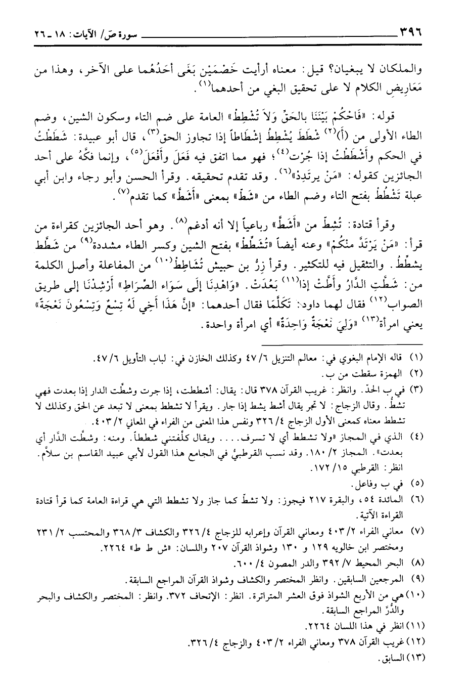 وقرأ قتادة: تُشِطّ من «أَشَطَّ رباعياً إلا أنه أدغم وهو أحد الجائزين كقراءة من قرأ» مَنْ يَرْتَدَّ منْكُمْ «وعنه أيضاً تُشَطِّطْ» بفتح الشين وكسر الطاء مشددة من شَطَّط يشطِّطُ. شَطَّتِ الدَّارُ وأَطَّتْ إذا بَعُدَتْ وَاهْدِنَا إلَى سَوَاء الصِّرَاطِ «أَرْشِدْنَا إلى طريق الصواب فقال لهما داود: تَكَلَّمَا فقال أحدهما:» إنَّ هَذَا أَخِي لَهُ تِسْعٌ وَتِسْعُونَ نَعْجَةً «يعني امرأة» وَلِيَ نعْجَةٌ وَاحِدَةٌ «أي امرأة واحدة.