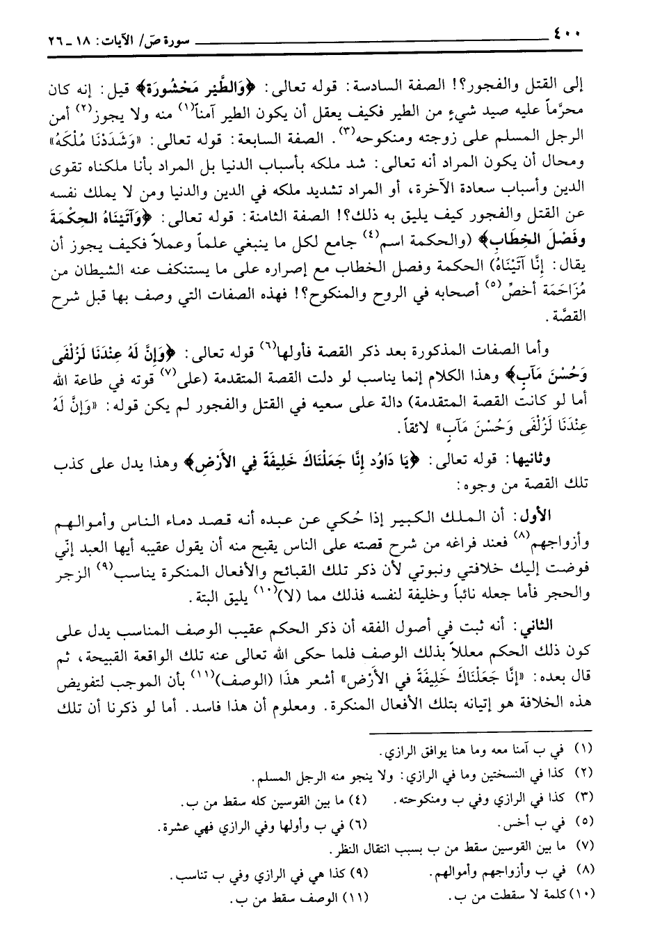 إلى القتل والفجور؟ {الصفة السادسة: قوله تعالى: {والطير مَحْشُورَةً} قيل: إنه كان محرَّماً عليه صيد شيءْ من الطير فكيف يعقل أن يكون الطير آمناً منه ولا يجوز أمن الرجل المسلم على زوجته ومنكوحه الصفة السابعة: قوله تعالى: {وَشَدَدْنَا مُلْكَهُ} ومحال أن يكون المراد أنه تعالى: شد ملكه بأسباب الدنيا بل المراد بأنا ملكناه تقوى الدين وأسباب سعادة الآخرة، أو المراد تشديد ملكه في الدين والدنيا ومن لايملك نفسه عن القتل والفجور كيف يليق به ذلك؟} الصفة الثامنة: قوله تعالى: {وَآتَيْنَاهُ الحكمة وَفَصْلَ الخطاب} (والحكمة اسم جامع لك ما ينبغي علماً وعملاً فكيف يجوز أن يقال: إِنَّا آتَيْنَاهُ) الحكمة وفصل الخطاب مع إصراره على ما يستنكف عنه الشيطان من مُزاَحَمَة أخصِّ أصحابه في الروح والمنكوح؟! فهذه الصات التي وصف بها قبل شحر القصَّة.
