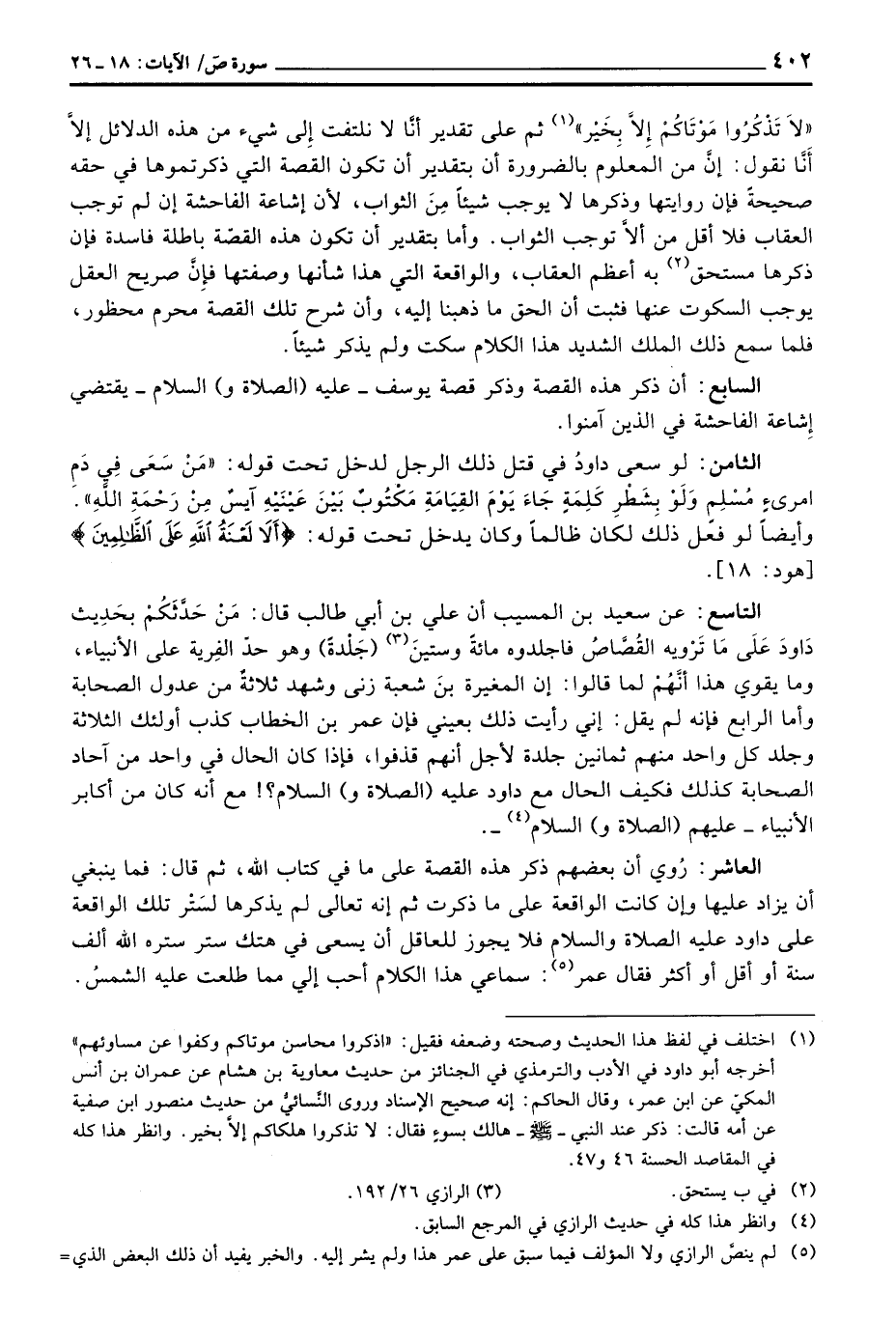 «لاَ تَذْكُرُوا مَوْتَاكُمْ إِلاَّ بِخَيْر» ثم على تقدير أنَّا لا نلتفت إلى شيء من هده الدلائل إلاَّ أَنَّا نقول: إنَّ من المعلوم بالضرورة أن بتقدير أن تكون القصة التي ذكرتموها في حقه صحيحةً فإن روياتها وذكرها لا يوجب شيئاً مِنَ الثواب، لأن إشاعة الفاحشة إن لم توجب العقاب فلا أقل من ألاَّ توجب الثواب. وأما بتقدير أن تكون هذه القصة باطلة فاسدة فإن ذكرها مستحق به أعظم العقاب، والواقعة التي هذا شأنها وصفتها فإنَّ صريح العقل يوجب السكوت عنها فثبت أن الحق ما ذهبنا إليه، وأن شرح تلك القصة محرم محظور، فلما سمع ذلك الملك الشديد هذا الكلام سكت ولم يذكر شيئاً.