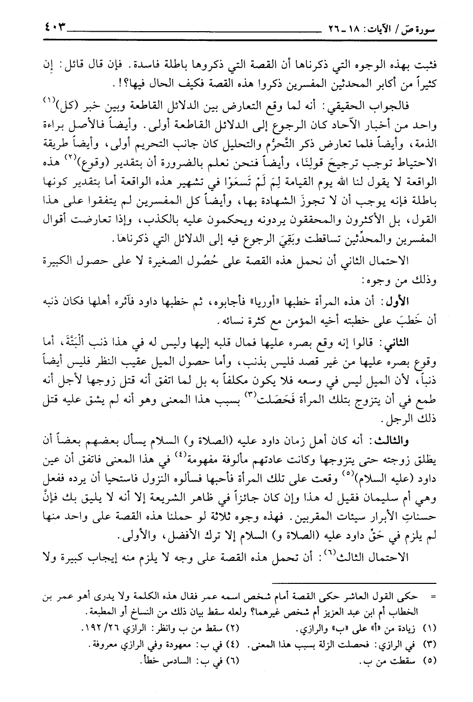 والثالث: أنه كان أهل زمان داود عليه (الصلاة و) السلام يسأل بعضهم بعضاَ أن يطلق زوجته حتى تزوجها وكانت عادتها مألوفة مفهومة في هذا المعنى فاتفق أن عين داود (عليه السلام) وقعت على تلك المرأة فأحبها فسألوه النزول فاستحيا أن يرده ففعل وهي أم سليمان فقيل له هذا وإن كان جائزاً في ظاهر الشريعة إلا أنه لا يليق بك فإنَّ حسناتِ الأبرار سيئات المقربين. فهذه وجوه ثلاثة لو حملنا هذه القصة على واحد منها لم يلزم في حَقِّ داود عليه (الصلاة و) السلام إلا ترك الأفضل، والأولى.