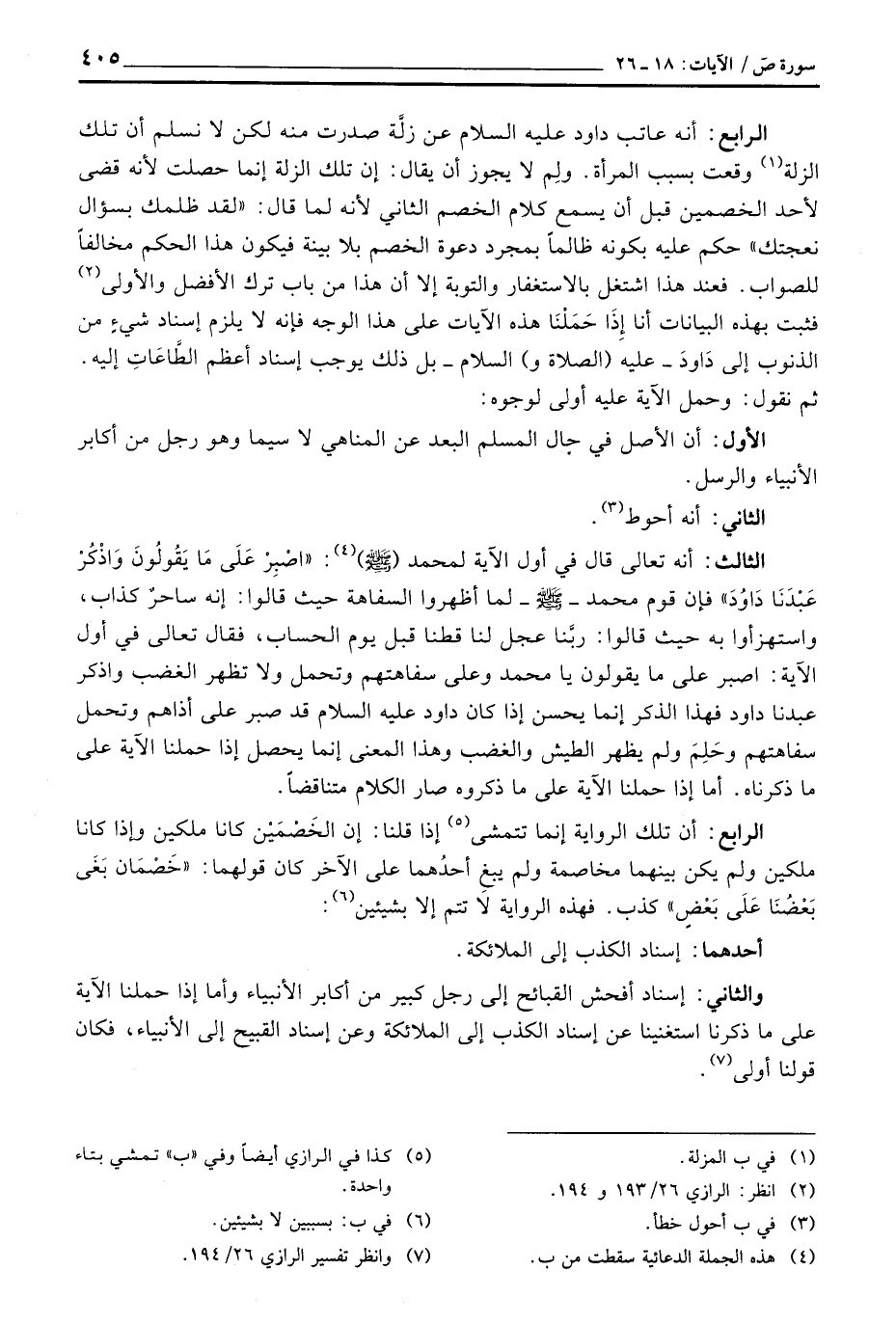 الرابع: أنه عاتب داود عليه السلام عن زلَّة صدرت منه لكن لا نسلم أن تلك الزلة وقعت بسبب المرأة ولِم لا يجوز أن يقال: إن تلك الزلة إنما حصلت لأنه قضى لأحد الخصمين قبل أن يسمع كلام الخصم الثاني لأنه لما قال: «لقد ظلمت بسؤال نعجتك» حكم عليه بكونه ظالماً بمجرد دعوة الخصم بلا بينة فيكون هذا الحكم مخالفاً للصواب. فعند هذا اشتغل بالاستغفار والتوبة إلا أن هذا من باب ترك الأفضل والأولى فثبت بهذه البيانات أنا إِذَا حَمَلْنَا هذه الآيات على هذا الوجه فإنه لا يلزم إسناد شيءٍ من الذنوب إلى دَاودَ - عليه (الصلاة و) السلام - بل ذلك يوجب إسناد أعظم الطَّاعَاتِ إليه. ثم نقول: وحمل الآية عليه أولى لوجوه: