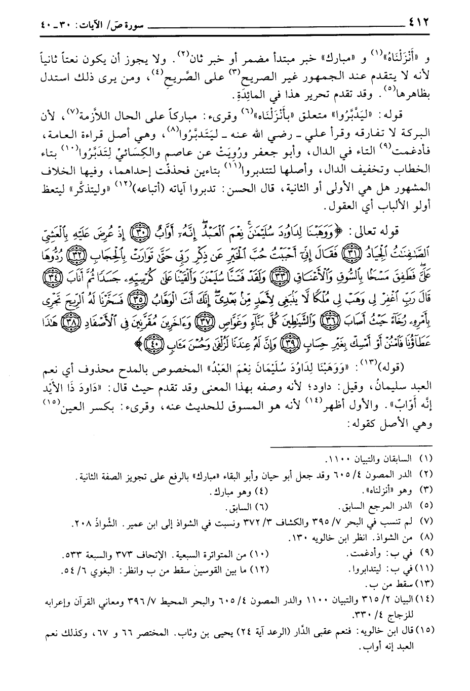 (قوله) : {وَوَهَبْنَا لِدَاوُودَ سُلَيْمَانَ نِعْمَ العبد} المخصوص بالمدح محذوف أي نعم العبد سليمانُ، وقيل: داود؛ لأنه وصفه بهذا المعنى وقد تقدم حيث قال: {ذَا الأيد إِنَّهُ أَوَّابٌ} [ص: 17] والأول أظهر لأنه هو المسوق للحديث عنه، وقرئ: بكسر العين وهي الأصل كقوله: