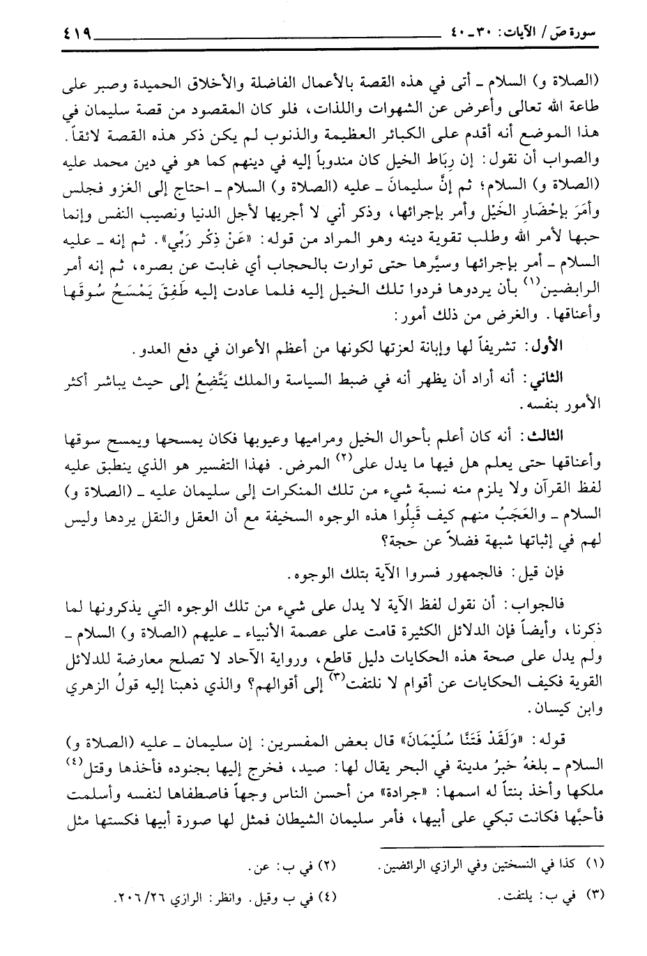 الصلاة و) السلام - أتى في هذه القصة بالأعمال الفاضلة والأخلاق الحميدة وصبر على طاعة الله تعالى وأعرض عن الشهوات واللذات، فلو كان المقصود من قصة سليمان في هذا الموضع أنه أقدم على الكبائر العظيمة والذنوب لم يكن ذكر هذه القصة لائقاً. والصواب أن نقوله: إن رِبَاط الخيل كان مندوباً إليه في دينهم كما هو في دين محمد عليه (الصلاة و) السلام؛ ثم إنَّ سليمانَ - عليه (الصلاة و) السلام - احتاج إلى الغزو فجلس وأمَرَ بإحْضَارِ الخَيْل وأمر بإجرائها، وذكر أني لا أجريها لأجل الدنيا ونصيب النفس وإنما حبها لأمر الله وطلب تقوية دينه وهو المراد من قوله: {عَن ذِكْرِ رَبِّي} ثم إنه - عليه السلام - أمر بإجرائها وسيَّرها حتى توارت بالحجاب أي غابت عن بصره، ثم إنه أمر الرابضين بأن يردوها فردوا تلك الخيل إليه فلما عادت إليه طَفِقَ يَمْسَحُ سُوقَها وأعناقها والغرض من ذلك أمور: