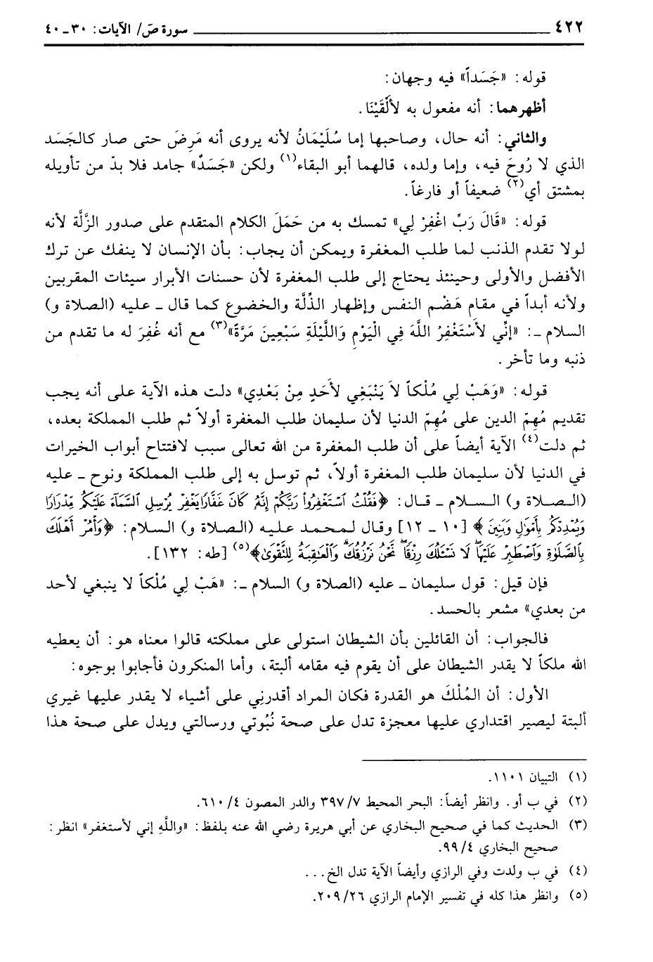 فالجواب: أن القائلين بأن الشيطان استولى على مملكته قالوا معناه هو: أن يعطيه الله ملكاً لا يقدر الشيطان على أن يقوم فيه مقامه ألبتة، وأما المنكرون فأجوابوا بوجوه: