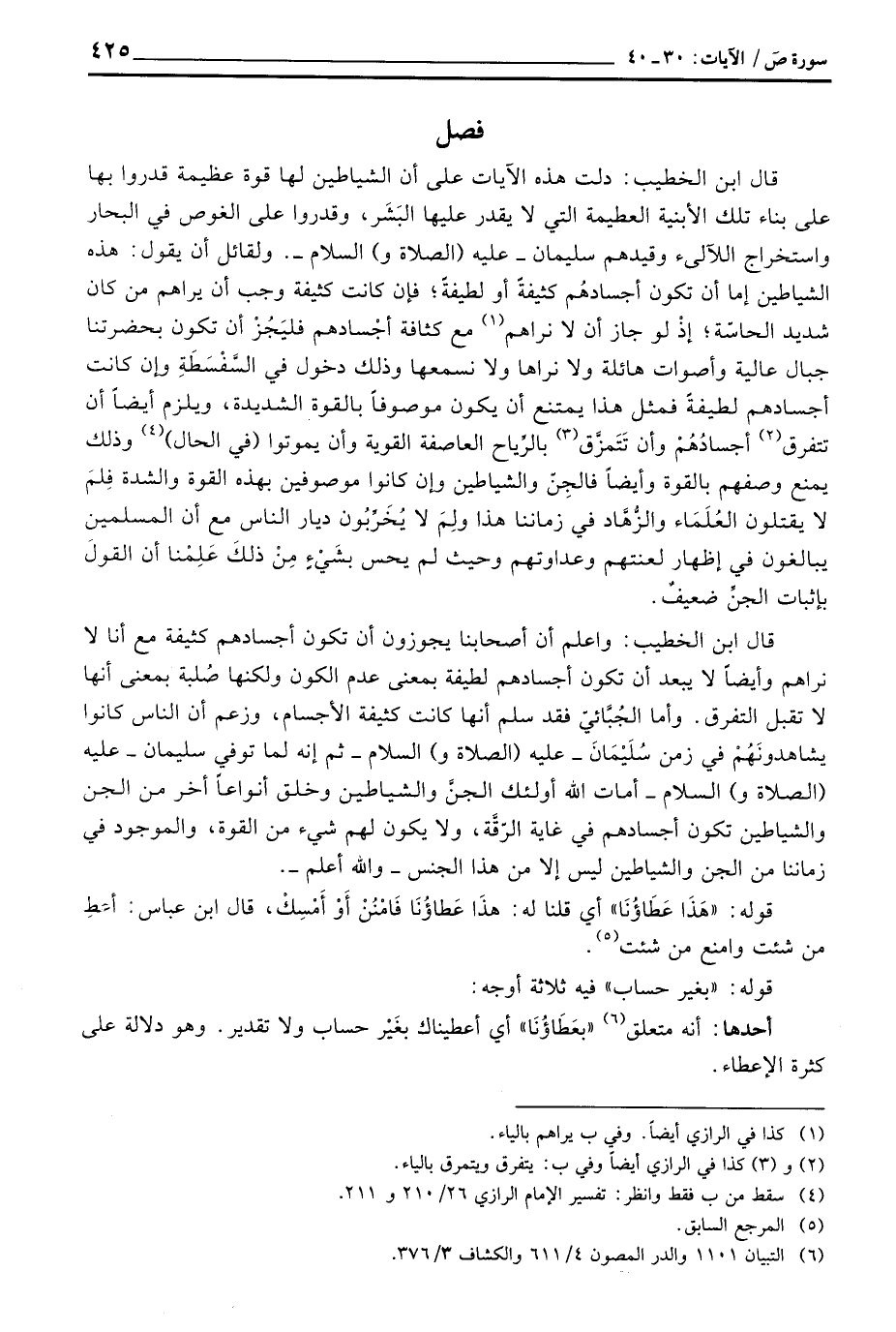 قال ابن الخطيب: دلت هذه الآية على أن الشياطين لها قولة عظيمة قدروا بها على بناء تلك الأبنية العطيمة التي لا يقدر عليها البَشَر، وقدروا على الغوص في البحار واستخراد الآلئ وقيدهم سليمان - عليه (الصلاة و) السلام -. ولقائل أن يوقل: هذه الشياطين إما أن تكون أجسادهُم كثيفةً أو لطيفةً؛ فإن كانت كثيفة وجب أن يراهم من كان شديد الحاسّة؛ إذْ لو جاز أن لا نراهم مع كثافة أجْسادهم فليَجُزْ أن تكون بحضرتنا جبال عالية وأصوات هائلة ولا نراها ولا نسمعها وذلك وذلك دخول في السَّفْسَطَةِ وإن كانت أجسادهم لطيفةً فمثل ها يمتنع أن يكون موصوفاً بالقوة الشديدة، ويلزم أيضاً أن تتفرق أجسادُهُمْ وأن تَتَمزَّق بالرِّياح العاصفة القوية وأن يموتوا (في الحال) وذلك يمنع وصفهم بالقوة وأيضاً فالجِنّ والشياطين وإن كانوا موصوفين بهذه القوة والشدة فِلَمَ لا يقتلون العُلَمَاء والزُّهَّاد في زماننا هذا ولِمَ لا يُخَرِّبُون ديار الناس مع أن المسلمين يبالغون في إظهار لعنتهم وعدواتهم وحيث لم يحس بشَيْءٍ مِنْ ذلكَ عَلِمْنَا أن القولَ بإثبات الجنِّ ضعيفٌ.