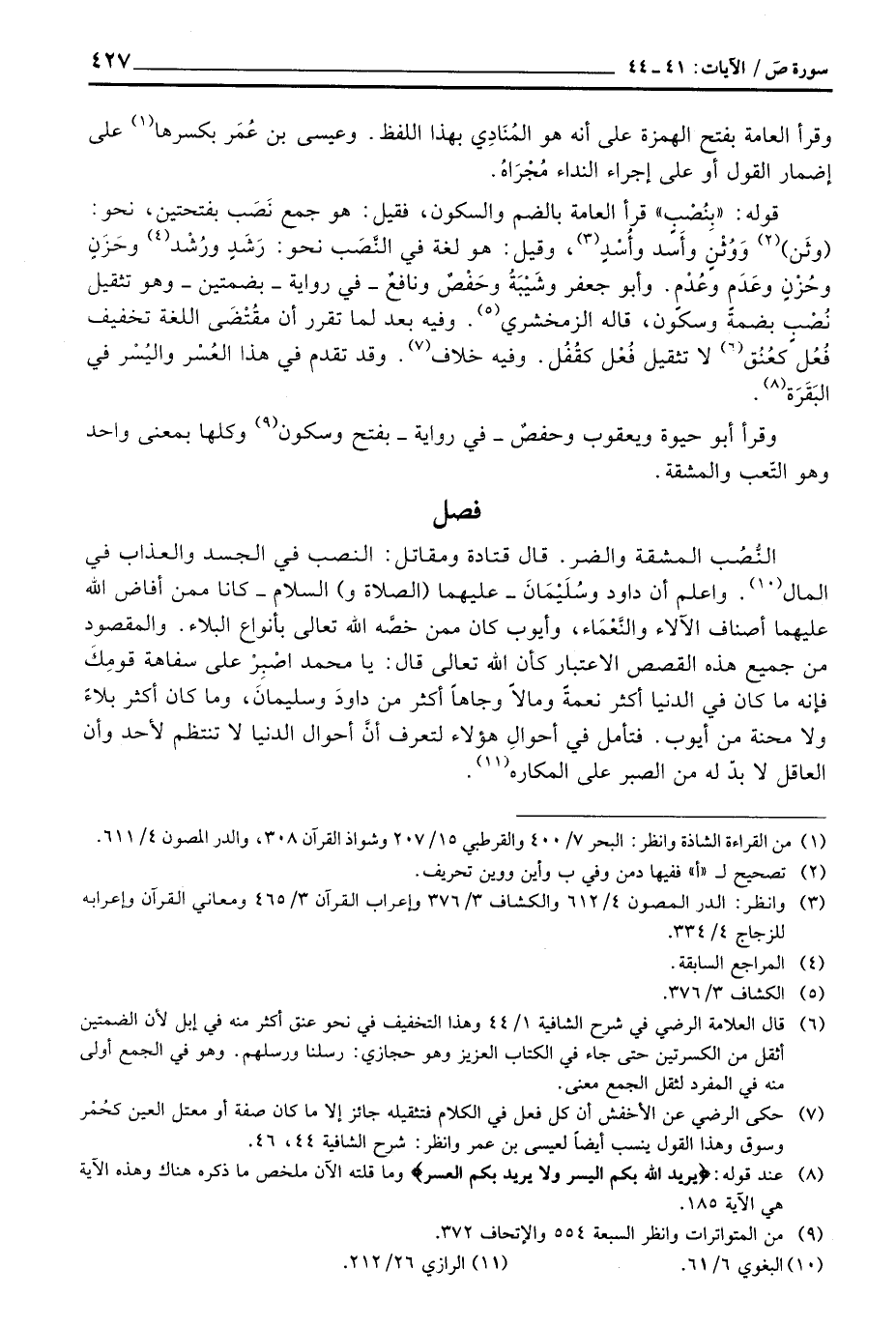 النُّصُب المشقة والضر. قال قتادة ومقاتل: النصب في الجسد والعذاب في المال واعلم أن داود سُلَيْمَانَ - عليهما (الصلاة و) السلام - كانا ممن أفاض الله عليهما أصناف الآلاء والنَّعْمَاء، وأيوب كان ممن خصَّه الله تعالى بأنواع البلاء. والمقصود من جميع هذه القصص الاعتبار كأن الله تعالى قال: يا محمد اصْرِرْ على سفاهة قومِكَ فإنه ما كان في الدنيا أكثر نعمةً ومالاً وجاهاً أكثر من داودَ وسليمانَ، وما كان أكثر بلاءً ولا محنة من أيوب. فتأمل في أحوالِ هؤلاء لتعرف أنَّ أحوال الدنيا لا تنتظم لأحد وأن العاقل لا بدّ له من الصبر على المكاره.