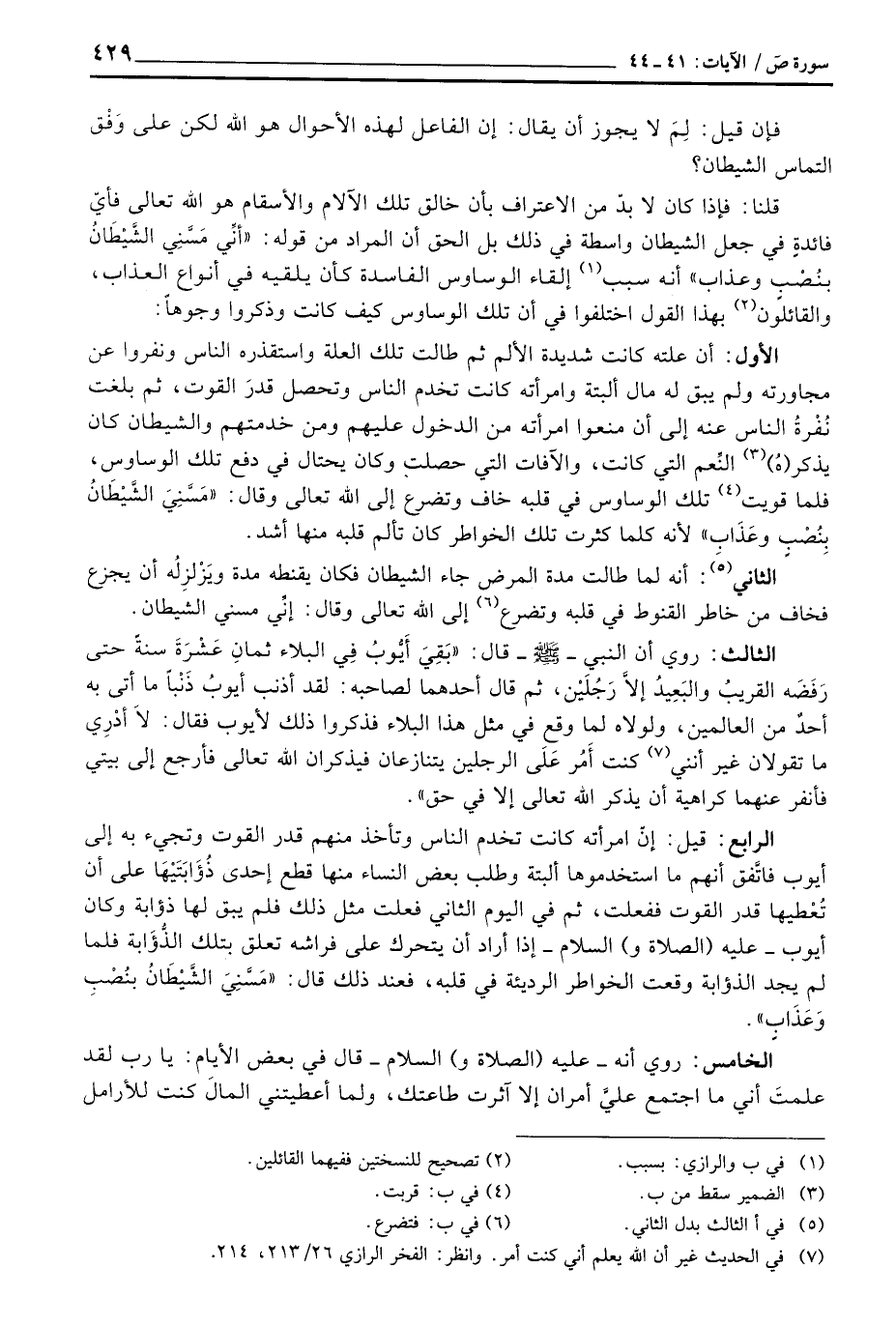 قلنا: فإذا كان لا بدّ من الاعتراف بأن خالق تلك الآلام والأسقام هو الله تعالى فأيّ فائدةٍ في جعل الشيطان واسطة في لك بل الحق أن المراد في قوله: {أَنِّي مَسَّنِيَ الشيطان بِنُصْبٍ وَعَذَابٍ} أنه سبب إلقاء الوساوس الفاسدة كأن يلقيه في أنواع العذاب، والقائلون بهذا القول اختلفوا في أن تلك الوساوس كيف كانت وذكروا وجوهاً:
