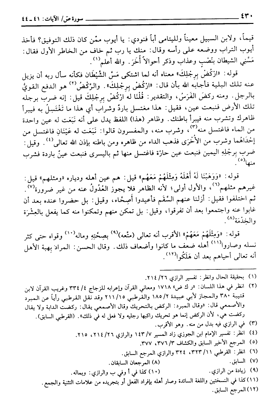 قوله: {اركض بِرِجْلِكَ} معناه أنه لما اشتكى مَسَّ الشَّيْطَان فكأنه سأل ربه أن يزيل عنه تلك البلية فأجابه الله بأن قال: {اركض بِرِجْلِكَ} والرَّكْضُ هو الدفع القويُّ بالرجل. ومنه ركضَ الفَرَسُن والتقدير قُلْنَا له ارْكُضْ بِرِجْلِكَ قيل: إنه ضرب برجله تلك الأرض فنبعت عين، فقيل: هذا مغتسل باردٌ وشراب أي هذا ما تَغْتَسِلُ به فيبرأ ظاهرك وتشرب منه فيبرأ باطنك. وظاهر (هذا) اللفظ يدل على أنه نَبَعَت له عين واحدة من الماء فاغتسل منه، وشرب منه، والمفسرون قالوا: نَبَعَت له عَيْنَانٍ فاغتسل من إحْدَاهُما وشرب من الأُخْرَى فذهب الداء من ظاهره ومن باطنه بإذن الله تعالى. وقيل: ضرب بِرجْلِهِ اليمين فنبعت عين حارّة فاغتسل منها ثم بالسرى فنبعت عينٌ باردة فشرب منها.