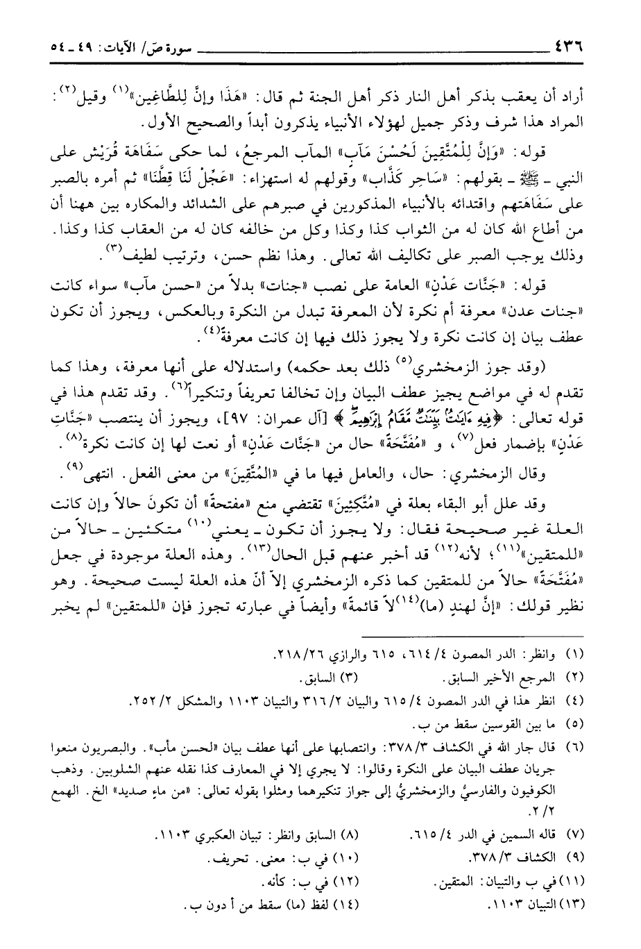 (وقد جوز الزمخشري ذلك بعد حكمه) واستدلاله على أنها معرفة، وهذا كما تقدم له في مواضع يجيز عطف البيان وإن تخلفا تعريفاً وتنكيراً. وقد تقدم هذه في قوله تعالى: {فِيهِ آيَاتٌ بَيِّنَاتٌ مَّقَامُ إِبْرَاهِيمَ} [آل عمران: 97] ويجوز أن ينتصب «جَنَّاتِ عَدْنٍ» بإضمار فعل، و «مُخَتَّحَةً» حال من «جَنَّات عَدْنٍ» أو نعت لها إن كانت نكرة.