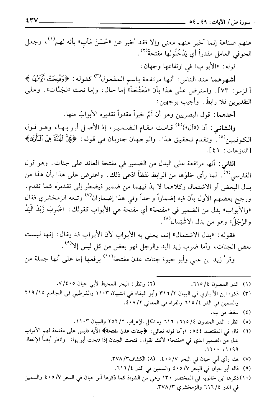 الثاني: أنها مرتفعة على البدل من الضمير في متفحة العائد على جنات. وهو قول الفارسي لما رأى خلوّها من الرابط لفظاً ادّعى ذلك. واعترض على هذا بأن هذا من بدل البعض أو الاشتمال وكلاهما لا بدّ فيهما من ضمير فيضطر إلى تقديره كما تقدم. ورجح بعضهم الأول بأن فيه إضماراً واحداً وفي هذا إضماران وتبعه الزمخشري فقال «والأبواب» بدل من الضمير في «مفتحة» أي مفتحة هي الأبواب كقولك: «ضُرِبَ زَيْدٌ الْيَدُ والرِّجْلُ» وهو من بدل الاشْتِمال.