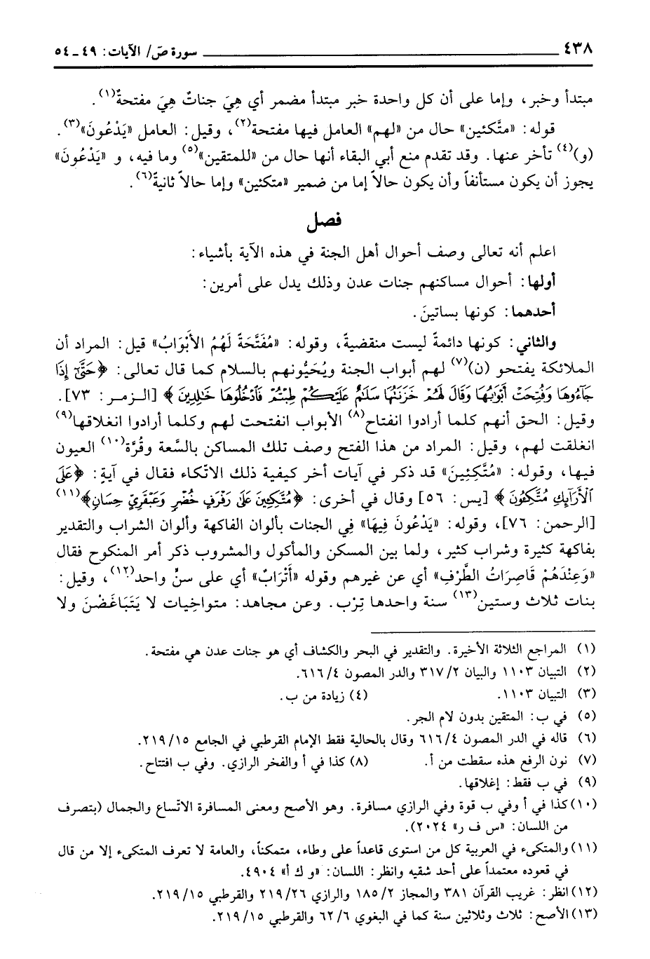 والثاني: كونها دائمةً ليست منقضيةً، وقوله: {مُّفَتَّحَةً لَّهُمُ الأبواب} قيل: المراد أن الملائكة يفتحو (ن) لهم أبواب الجنة يُحَيُّونهم بالسلام كما قال تعالى: {حتى إِذَا جَآءُوهَا وَفُتِحَتْ أَبْوَابُهَا وَقَالَ لَهُمْ خَزَنَتُهَا سَلاَمٌ عَلَيْكُمْ طِبْتُمْ فادخلوها خَالِدِينَ} [الزمر: 73] وقيل: الحق أنهم كلما أرادوا انفتاح الأبواب انفتحت لهم وكلما أرادوا انغلاقها انغلقت لهم، وقيل: المراد من هذا الفتح وصف تلك المساكن بالسِّعة وقُرَّة العيون فيها، وقوله: {مُتَّكِئِينَ} قد ذكر في آيات أخر كيفية ذلك الاتّكاء فقال في آيةٍ {عَلَى الأرآئك مُتَّكِئُونَ} [يس: 56] وق في آخرى: {مُتَّكِئِينَ على رَفْرَفٍ خُضْرٍ وَعَبْقَرِيٍّ حِسَانٍ} [الرحمن: 76] «يَدْعُونَ فِيهَا» فِي الجنات بألوان الفاكهة وألوان الشراب والتقدير بفاكهة كثيرة وشارب كثير، ولما بين المسكن والمأكول والمشروب ذكر ألأمر المنكوح فقال {أَتْرَابٌ} أي من غيرهم وقوله «أَتْرَابٌ» أي على سنِّ واحد، وقيل: بنات ثلاث وستين سنة واحدها تِرْب. وعند مجاهد: متواخِيات لا يَتَبَاغَضْنَ ولا