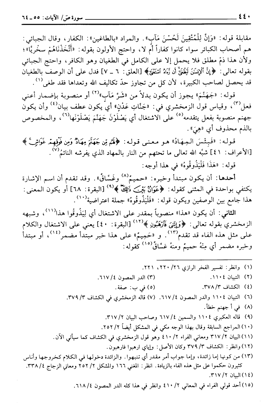 مقابلة قوله: {هذا وَإِنَّ لِلطَّاغِينَ لَشَرَّ مَآبٍ} والمراد «بالطاغين» : الكفار، وقال الجبائي: هم أصحاب الكبائر سواء كانوا كفاراً أم لا، واحتج الأولون بقوله: {أَتَّخَذْنَاهُمْ سِخْرِيّاً} ؛ ولأن هذا ذمّ مطلق فلا يحمل إلا على الكامل في الطغيان وهو الكافر، واحتج الجبائي بقوله تعالى: {إِنَّ الإنسان ليطغى أَن رَّآهُ استغنى} [العلق 6 - 7] فدل على أن الوصف بالطغيان قد يحصل لصاحب الكبيرة، لأن كل من تجاوز حدّ تكاليف الله وتعداها فقد طغى.