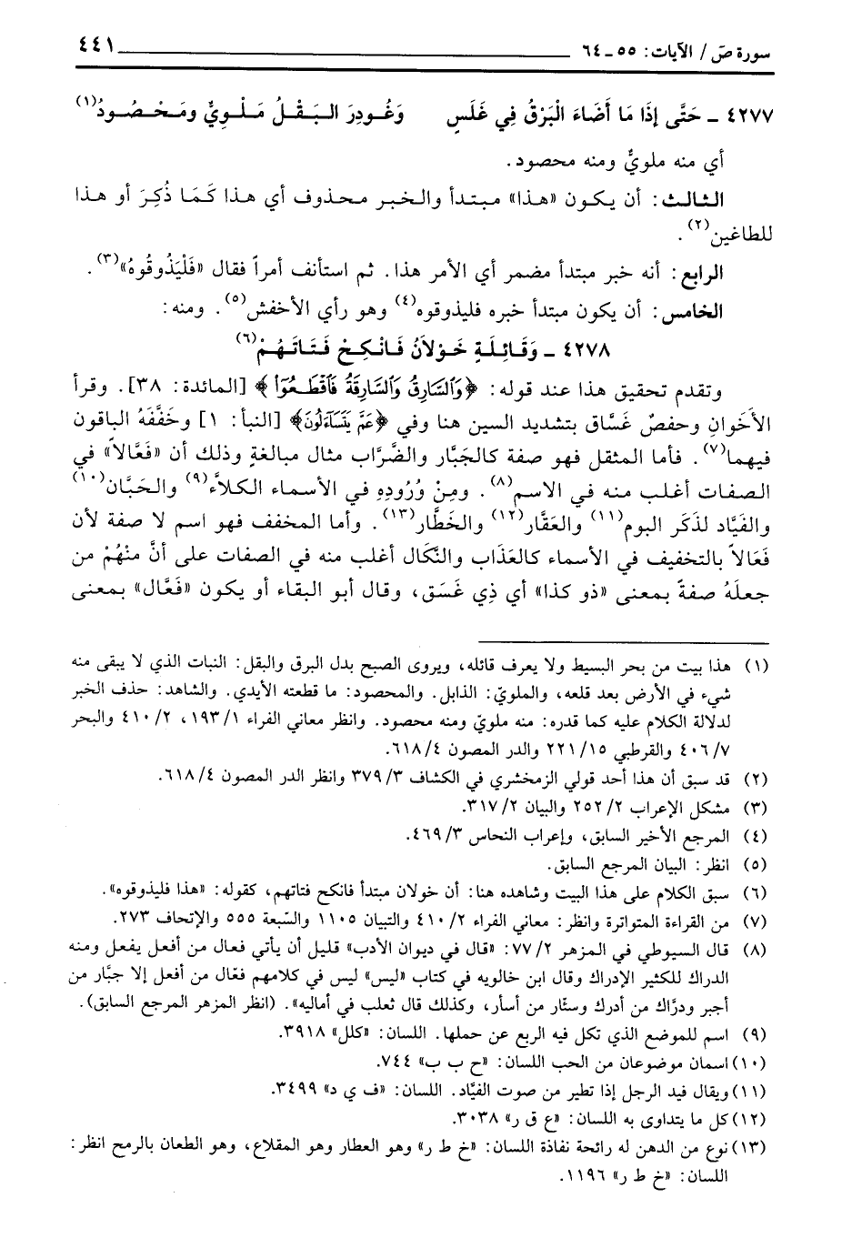 4278 - وَقَائِلَةٍ خَوْلاَنُ فَانْكِحْ فَتَاتَهُمْ ... وتقدم تحقيق هذا عند قوله: {والسارق والسارقة فاقطعوا} [المائدة: 38] وقرأ الأَخَوانِ وحفصٌ غَسَّاق بتشديد السين هنا وفي {عَمَّ يَتَسَآءَلُونَ} [النبأ: 1] وخَفَّفَهُ الباقون فيها فأما المثقل فهو صفة كالجّبَّار والضَّرَاب مثال مبالغةٍ وذلك أن «فَعَّالاً» في الصفات أغلب منه في الاسم ومِنْ وُرُودِهِ في الأسماء الكلاَّء والحَبَّان والفَيًَّاد لذَكَر البوم والعَقَّار والخَطَّار وأما المخفف فهو اسم لا صفة لأن فَعَالاً بالتخفيف في الأسماء كالعَذَاب والنَّكَال أغلب منه في الصفات على أنَّ منْهُمْ من جعلَهُ صفةً بمعنى «ذو كذا» أي ذِي غَسَق، وقال أبو البقاء أو يكون «فَعَّال» بمعنى
