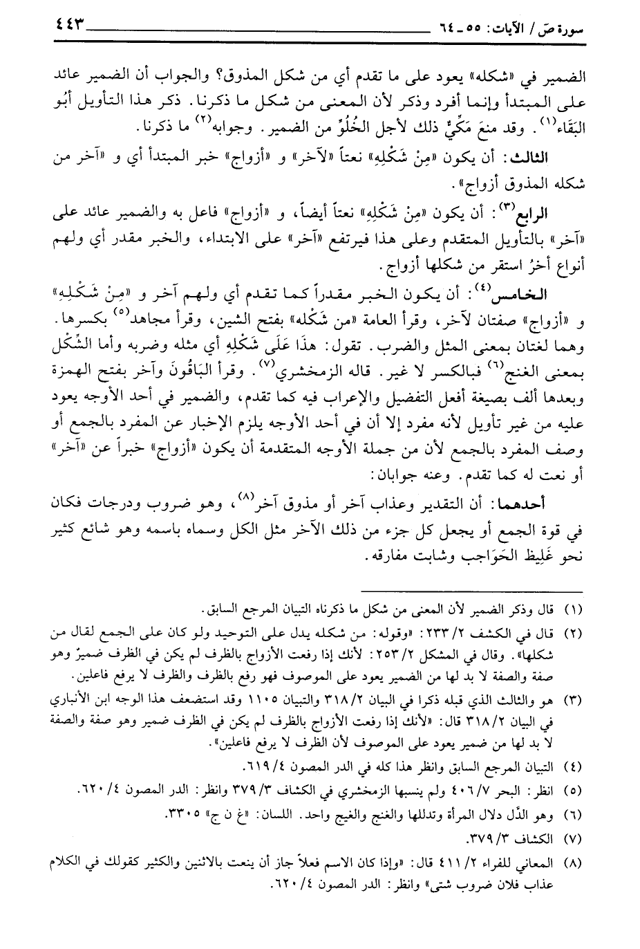 الخامس: أن يكون الخبر مقدراً كما تقدم أي ولهم آخر و «مِنْ شَكْلِهِ» و «أزواج» صفتان لآخر، وقرأ العامة «من شَكْله» بفتح الشين، وقرأ مجاهد بكسرها وهما لغتان بمعنى المثل والضرب. تقوله: هذَا عَلَى شَكْلِهِ أي مثله وضربه وأما الشِّكْل بمعنى الغنج فبالكسر لا غير. قاله الزمخشري وقرأ البَاقُونَ وآخر بفتح الهمزة عليه من غير تأويل لأنه مفرد إلا أن في أحد الأوجه يلزم الإخبار عن المفرد بالجمع أو وصف المفرد بالجمع لأن من جملة الأوجه المتقدمة أن يكون «أزواج» خبراً عن «آخر» أو نعت له كما تقدم. وعنه جوابان: