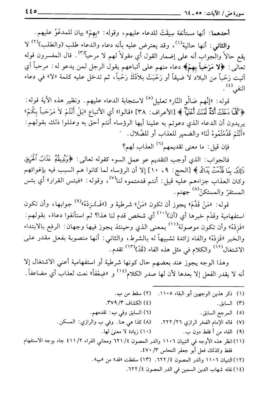 قوله: {إِنَّهُمْ صَالُو النار} تعليل لاستجابة الدعاء عليهم ونظير هذه الآية قوله: {كُلَّمَا دَخَلَتْ أُمَّةٌ لَّعَنَتْ أُخْتَهَا} [الأعراف: 38] «قالوا» أي الأتباع {بَلْ أَنتُمْ لاَ مَرْحَباً بِكُمْ} يريدون أن الدعاء الذي دعوتم به علينا أيها الرؤساء أنتم أحق به وعللوا ذلك بقوهم: «أَنْتُمْ قَدَّمْتُمُوهُ لَنَا» والضمير للعذاب أو للضَّلال.