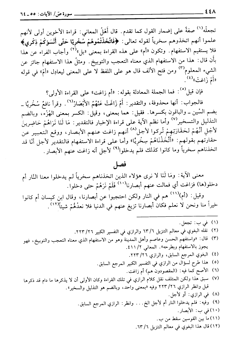 فالجواب: أنها محذوفة، والتقدير: أَمْ زَاغَتْ عَنْهُمُ الأَبْصَارُ وقرأ نافعٌ سُخْريًّا - بضم السِّين - والباقون بكسرها فقيل: هما بمعنى، وقيل: الكسر بمعنى الهُزْء، وبالضم التذليل والتسخير وأما نظم الآية على قراءة الإخبار فالتقدير: مَا لَنَا نَرَاهُمْ حَاضِرينَ لأجْلِ أنَّهُمْ لحَقَارَتِهمْ تُركوا لأجل أنهم زاغت عنهم الأبصار، ووقع التعبير عن حقارتهم بقولهم: «أَتَّخَذْنَاهُمْ سِخْريًّا» وأما على قراءة الاستفهام فالتقدير لأجل أنّا قد اتخذناهم سخرياً وما كانوا كذلك فلم يدخلوا لأجل أنه زاغت عنهم الأبصار.