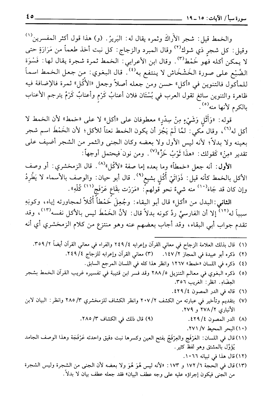 الأول: أنه جعل «خمطاً» وما بعده إما صفة «لأكُل» قال الزمخشري: أو وصف الأكل بالخمط كأنه قيل: ذَوَاتَىْ أُكُلٍ بشيع. قال أبو حيان: والوصف بالأسماء لا يَطَّرِدُ وإن كان قد جَاءَ منه شيءٌ نحو قولهم: «مَرَرْت بقَاعٍ عَرْفَج كُلّهٍ» .
