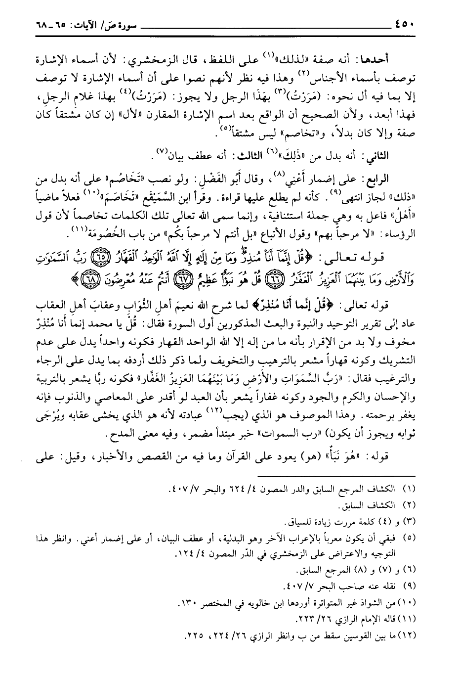 أحدها: أنه صفة» لذلك «على اللفظ، قال الزمخشري: لأن أسماء الإشارة توصف بأسماء الأجناس وهذا فيه نظر لأنهم نصوا على أن أسماء الإشارة لا توصف إلا بما فيه أل نحوه: (مَرَرْتُ) بهَذَا الرجل ولا يجوز:» مَرَرْتُ «بهذا غلامِ الرجلِ، فهذا أبعد، ولأن الصحيح أن الواقع بعد اسم الإشارة المقارن» لأل «إن كان مشتقاً كان صفة وإلا كان بدلاً، و» تخاصم «ليس مشتقاً.