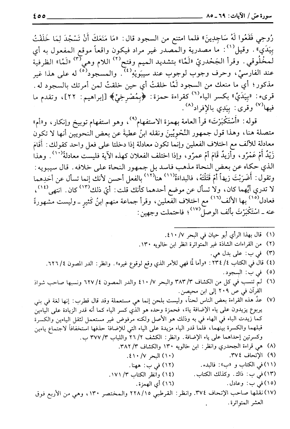 رُّوحِي فَقَعُواْ لَهُ سَاجِدِينَ} [الحجر: 29] فلما امتنع من السجود قال: {مَا مَنَعَكَ أَن تَسْجُدَ لِمَا خَلَقْتُ بِيَدَيَّ} وقيل: ما مصدرية غير مارد فيكون واقعاً موقع المفعول به أي لمخْلُوقي. وقرأ الجّحْدريّ «لَمَّا» بتشديد الميم وفتح اللام وهي «لَمَّا» الظرفية عند الفارسيِّ، وحرف وجوب لوجوب عند سيبَويْهِ، والمسجود له على هذا غير مذكور؛ أي ما منعك من السجود لَمَّا خلقتُ أي حين خلقتُ لمن مرتك بالسجود له.