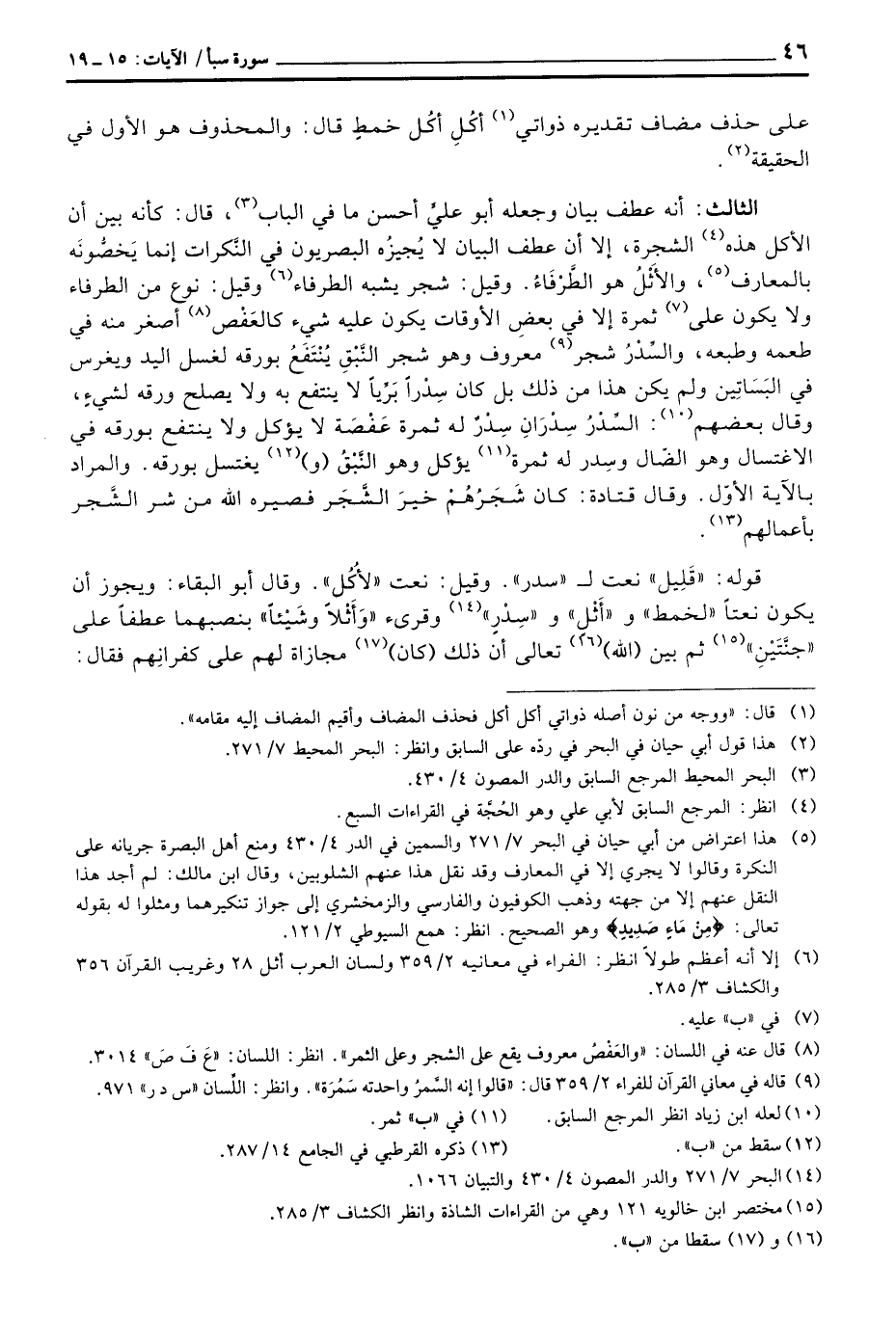 الثالث: أنه عطف بيان وجعله أبو عليِّ أحسن ما في الباب، قال: كأنه بين أن الأكل هذه الشجرة، إلا أن عطف البيان لا يُجيزُه البصريون في النَّكرات إنما يَخصُّونَه بالمعارف والأثْلُ هو الطَّرْفَاءُ. قويل: شجر يشبه الطرفاء وقيل: نوع من الطرفاء ولا يكون على ثمرة إلا في بعض الأوقات يكون عليه شيء كالعَفْص أصغر منه في طعمه وطبعه، والسِّدْرُ شجر معروف وهو شجر النَّبْقِ يُنْتَفَعُ به ولا يصلح ورقه لشيءٍ، وقال بعضهم: السِّدْرُ سِدْرَانِ سِدْرٌ له ثمرة عَفءصَة لا يؤكل ولا ينتفع بورقه. والمراد بالآية الأوّل. وقال قتادة: كان شَجَرُهُمْ خيرَ الشَّجَر فصيره الله من شر الشَّجر بأعمالهم.