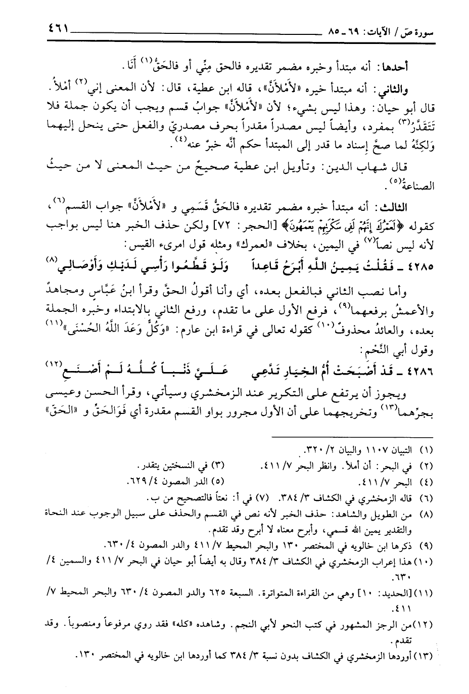 الثالث: أنه مبتدأ خبره مضمر تقديره فالحَقُّ قَسَمِي و «لأَمْلأَنَّ» جواب القسم، كقوله: {لَعَمْرُكَ إِنَّهُمْ لَفِي سَكْرَتِهِمْ يَعْمَهُونَ} [الحجر: 72] ولكن حذف الخبر هنا ليس بواجب لأنه ليس نصاً في اليمين، بخلاف «لعمرك» ومثله قول امرئ القيس: