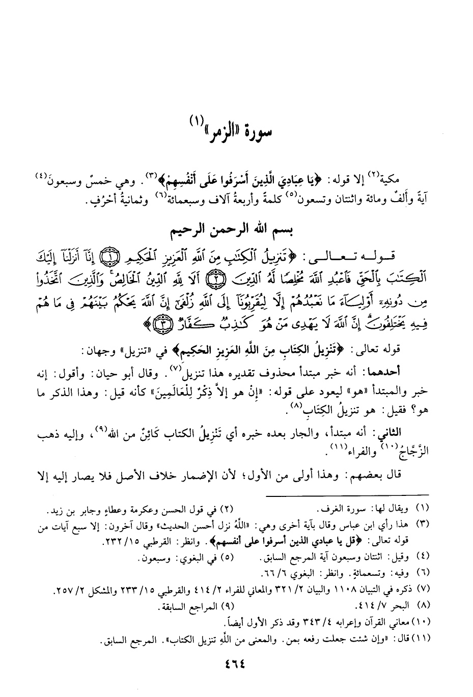 مكية إلا قوله: {يا عبادي الذين أسرفوا على أنفسهم} وهي خمس وسبعون آية وألف ومائة واثنتان وتسعون كلمة وأربعة آلاف وسبعمائة وثمانية أحرف. بسم الله الرحمن الرحيم قوله تعالى: {تَنزِيلُ الكتاب مِنَ الله العزيز الحكيم} في «تنزيل وجهان: