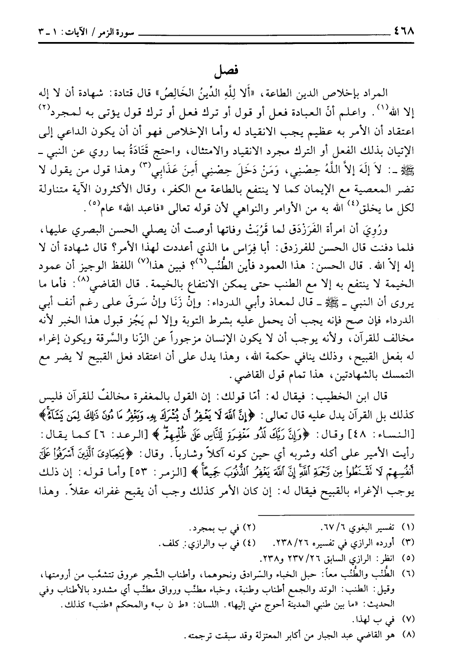 ورُوِيَ أن امرأة الفَرَزْدَق لما قَرُبَتْ وقاتها أوصلت أن يصلي الحسن البصري عليها، فما دفنت قال الحسن للفرزدق: أبا فِرَاس ما الذي أعددت لهذا الأمر؟ قال شهادة أن لا إله إلاّ الله. قال الحسن: هذا العمود فأي الطُّنُب؟ فبين هذا اللفظ الوجيز أن عمود الخيمة لا ينتفع به إلا مع الطنب حتى يمكن الانتفاع بالخيمة. قال القاضي: فأما ما يروى أن النبي - صَلَّى اللَّهُ عَلَيْهِ وَسَلَّم َ - قال لمعاذ وأبي الدرداء: وإنْ زَنَا وإنْ سَرقَ على رغم أنف أبي الدرداء فإن صح فإنه يجب أن يجب أن يحمل عليه بشرط التوبة وإلا لم يَجُز قبول هذا الخبر لأنه مخالف للقرآن، ولأنه يوجب أن يكون الإنسان مزجوراً عن الزّنا والسَّرقة ويكون إغراء له لفعل القبيح، وذلك ينافي حكمة الله، وهذا يدل على أن اعتقاد فعل القبيح لا يضر مع التمسك بالشهادتين، هذا تمام قول القاضي.