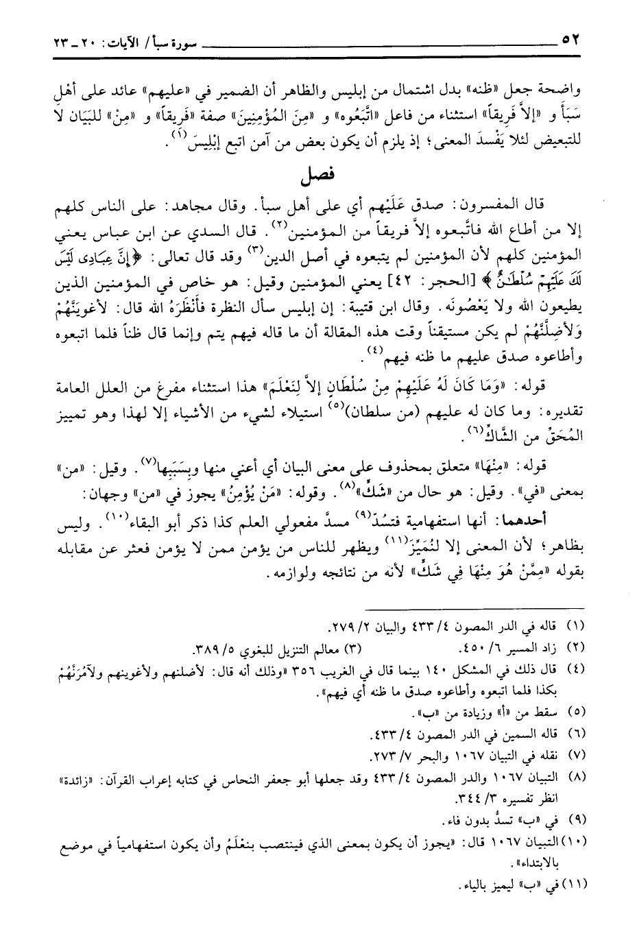 واضحة جعل «ظنه» بدل اشتمال من إبليس والظاهر أن الضمير في «عليهم» عائد على أهْلِ سَبَأَ و «إلاَّ فَريقاً» استثناء من فاعل «اتَّبَعُوه» «ومِنَ المُؤمِنِينَ» صفة «فَريقاً» و «مِنْ» للبَيَان لا للتبعيض لئلا يَفْسد المعنى؛ إذا يلزم أن يكون بعض من آمن اتبع إبْليسَ.