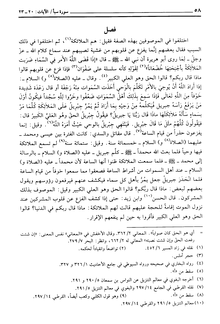 اختلفوا في الموصوفين بهذه الصفة فقيل: هم الملائكة، ثم اختلفوا في ذلك السبب فقال بعضهم إنَّما يفزع عن قلوبهم من غشية تصيبهم عند سماع كلام الله - عزّ وجلّ - لِمَا روى أبو هريرة أن نبي الله - صَلَّى اللَّهُ عَلَيْهِ وَسَلَّم َ - قال «إذَا قَضَى اللَّهُ الأمر فِي السَّمَاءِ ضَرَبت المَلاَئِكَةُ بأجْنِحَتِهَا خُضْعَاناً» لِقَوْلِهِ كأنه سلسلة على صَفْوان فإذا فزع عن قلوبهم قالوا ماذا قال ربكم؟ قالوا الحق هو العلي الكبير وقال - عليه (الصلاة و) السلام -: «خَوْفاً مِنَ اللَّهِ تَعَالَى فَإذَا سَمِعَ بِذَلِكَ أهْلُ السَّمَواتِ ضَعُفُوا وخَرُّوا لِلَّهِ سُجَّداً فيكُونُ أَوّلَ مَنْ يَرْفَعُ رَأسَهُ جبريل فُيَكلِّمهُ مِنْ وَحِيْهِ بَمَا أَرَادَ ثُمَّ يَمُرُّ جِبْريلُ عَلَى المَلاَئِكَةِ كُلَّمَا مَرَّ بسَماءٍ سَأَلَهُ مَلاَئِكَتُهَا ماذَا قَال رَبُّنَا يَا جبريلُ؟ فيقُول جِبْريلُ الحقّ وهُو العَليُّ الكبيرُ قال: فيَقُولُون كُلُّهُمْ مثْلَ مَا قَالَ جبْريل. فَيَنْتَهِي جِبْريلُ بالوحي حَيْثُ أَمَرَهُ اللَّهُ» وقيل: إنما يفزعون حذراً من قيام الساعة. قال مقاتل والسدي: كانت الفترة بين عيسى ومحمد - عليهما (الصلاة و) السلام - خمسمائة سنة. وقيل: سمتائة سنة لم تسمع الملائكة فيها وحياً فلما بعث الله محمداً - صَلَّى اللَّهُ عَلَيْهِ وَسَلَّم َ - كلَّم جبريل - عليه (الصلاة و) السلام - بالرسالة إلى محمد - صَلَّى اللَّهُ عَلَيْهِ وَسَلَّم َ - فلما سمعت الملائكة ظنوا أنها الساعة فصعقوا مما سمعوا خوفاً من قيام الساعة فلما انْحدَرَ جبريلُ جعل يمُرُّ بأهل كل سماء فيكشف عنهم فيرفعون رؤوسهم ويقول بعضهم لبعض: ماذا قال ربُّكم؟ قالوا الحق وهو العلي الكبير وقيل: الموصوف بذلك المشركون. قال الحسن وابن زيد: حتى إذا كشف الفزع عن قلوب المشركين عند نزول الموت إقامةً للحجة عليهم قالت لهم الملائكة: ماذا قال ربكم في الدنيا؟ قالوا الحق وهو العلي الكبير فأقروا به حين لم ينفعهم الإقرار.