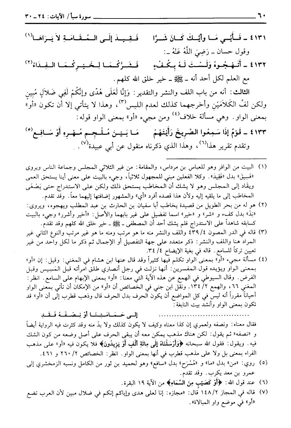 الثالث: أنه من باب الف والنشر والتقدير: وَإنَّا لَعَلَى هُدًى وإنَّكُمْ لَفِي ضَلاَلٍ مُبين ولكن لفَّ الكَلاَمَيْنِ وأخرجهما كذلك لعدم اللبس، وهذا لا يتأتي إلا أن تكون «أو» بمعنى الواو. وهي مسألة خلاف ومن مجيء «أو» بمعنى الواو قوله: