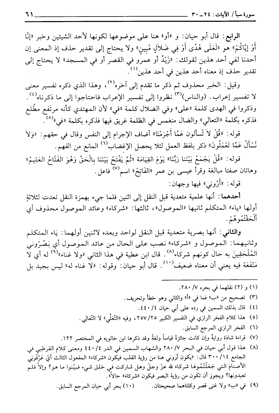 والثاني: أنها بصرية متعدية قبل النقل لواحد وبعده لاثنين أولهما: يَاء المتكلم وثانيهما: الموصول و «شركاء» نصب على الحال من عائد الموصول أي بَصِّرُوني المُلْحَقِينَ به حالَ كونهم شركاء قال ابن عطية في هذا الثاني «ولا غناء» له أي لا مَنْفَعَة فيه يعني أن معناه ضعيف. قال أبو حيان: وقوله: «لا غناء له» ليس بجيد بل