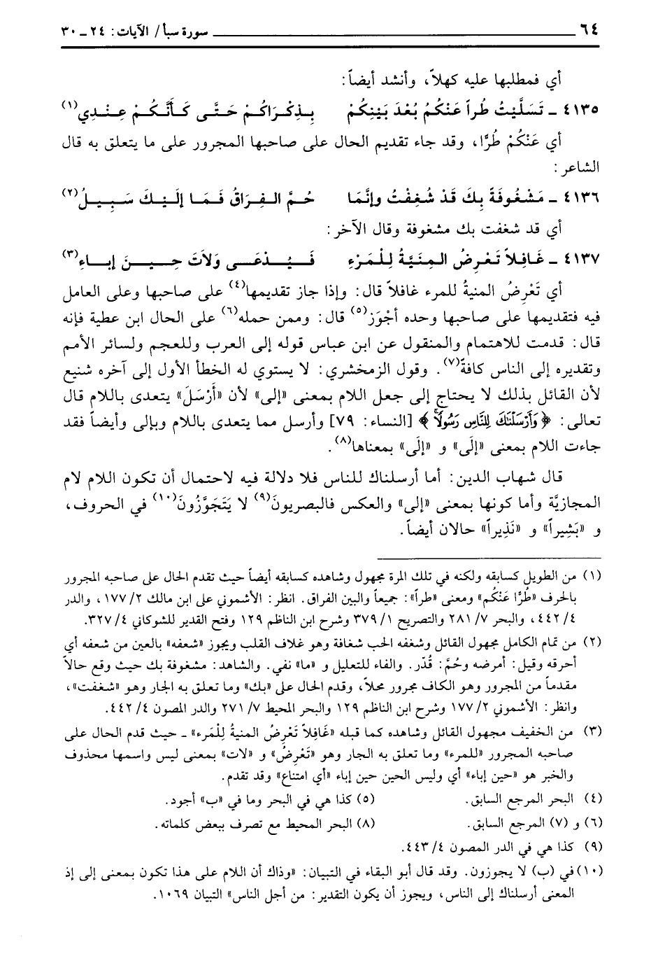 أي تَعْرِضُ المنيةُ للمرء غافلاً قال: وإذا جاز تقديمها على صاحبها وعلى العامل فيه فتقديمها على صاحبها وحده أجْوَز قال: وممن حمله على الحال ابن عطية فإن قال: قدمت للاهتمام والمنقول عن ابن عباس قوله إلى العرب وللعجم ولسائر الأمم وتقديره إلى الناس كافةً وقول الزمخشري: لا يستوي له الخطأ الأول إلى آخره شنيغ لأن القائل بذلك لا يحتاج إلى جعل اللام بمعنى «إلى» لأن «أَرْسَلَ» يتعدى باللام قال تعالى: {وَأَرْسَلْنَاكَ لِلنَّاسِ رَسُولاً} [النساء: 79] وأرسل مما يتعدى باللام وبإلى وأيضاً فقد جاءت اللام بمعنى «إلَى» و «إلَى» بمعناها.