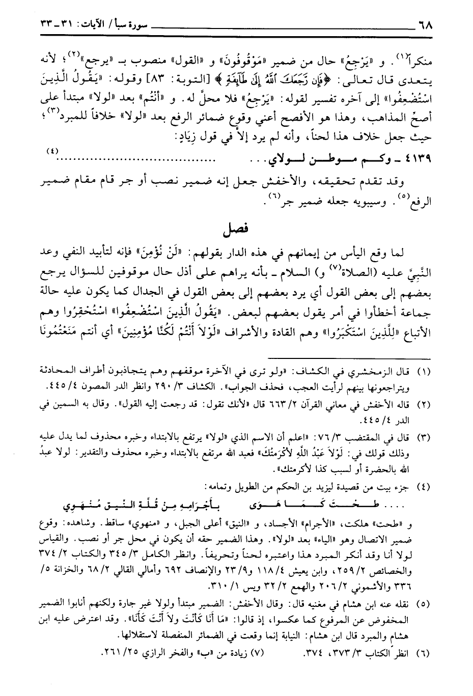منكراً «ويَرْجَعُ» حال من ضمير «مَوْقُوفُونَ» و «القول» منصوب ب «يرجع» ؛ لأنه يتعدى قال تعالى: {فَإِن رَّجَعَكَ الله إلى طَآئِفَةٍ} [التوبة: 83] وقوله: {يَقُولُ الذين استضعفوا} إلى آخره تفسير لقوله: «يَرْجِعُ» فلا محلَّ له. و «أنْتُم» بعد «لولا» متبدأ على أصحَّ المذاهب، وهذا هو الأفصح أعني وقوع ضمائر الرف بعد «لولا» خلافاً للمبرد حيث جعل خلاف هذا لحناً، وأنه لم يرد إلاَّ في قول زِيَادٍ: