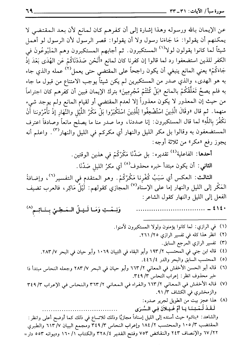 الثالث: العكس أي سَبَبُ كُفْرِنا مَكْرُكُمْ. وهو المتقدم في التفسير وإضافةُ المَكْر إلى الليل والنهار إما على الإسناد المجازي كقولهم: لَيْلٌ مَاكِر، فالعرب تضيف الفعل إلى الليل والنهار كقول الشاعر: