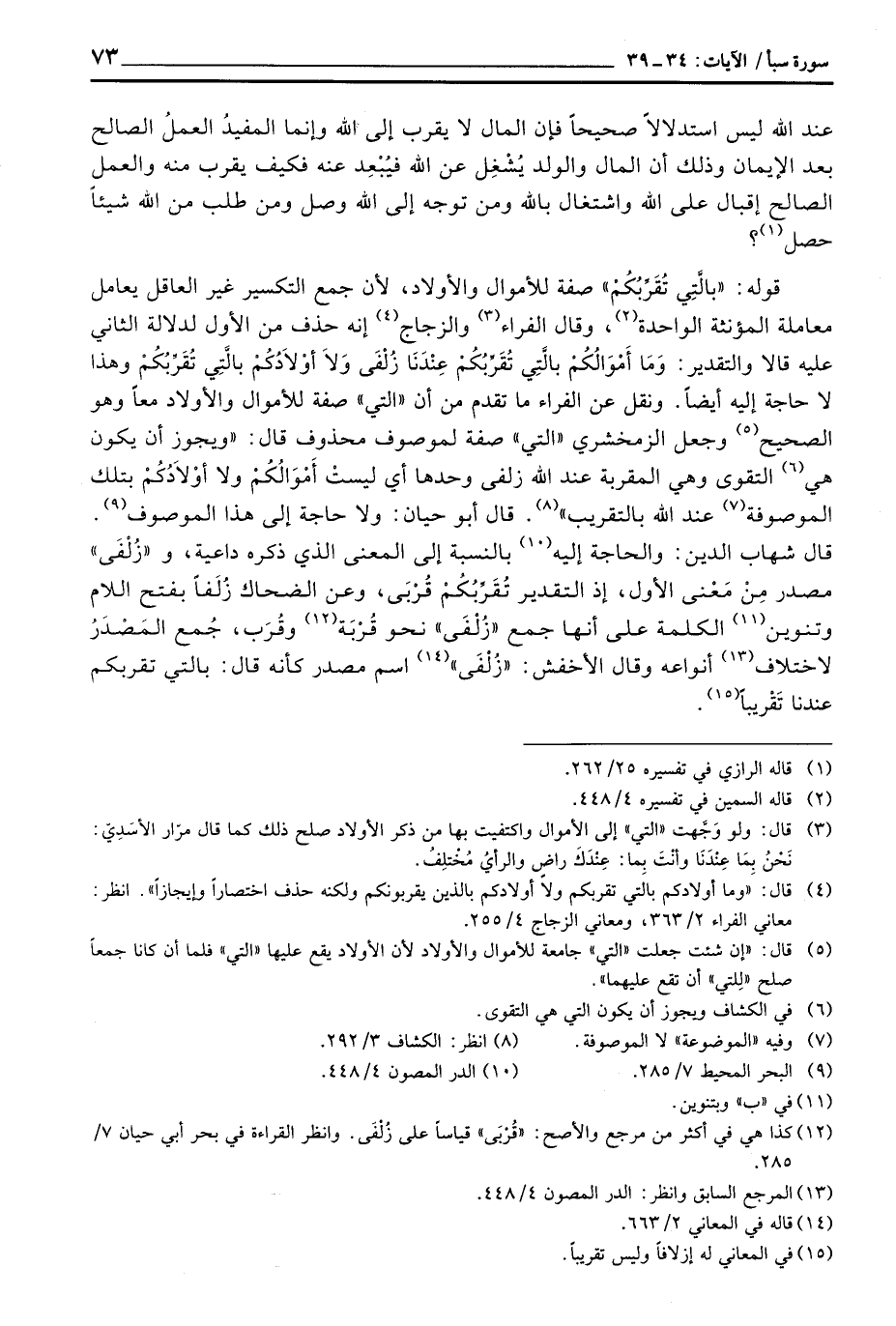 قال شهاب الدين: والحاجة إليه بالنسبة إلى المعى الذي ذكره داعية، و «زُلْفَى» مصدر مِنْ مَعْنى الأول، إذ التقدير تُقَرِّبُكُمْ قُرْبَى، وعن الضحاك زُلَفاً بفتح اللام وتنوين الكلمة على أنها جمع «زُلْفَى» نحو قُرْبَة وقُرَب، جُمع المَصْدَرُ لاختلاف أنواعه وقال الأخفش: «زُلْفَى» اسم مصدر كأنه قال: بالتي تقربكم عندنا تَقْريباً.